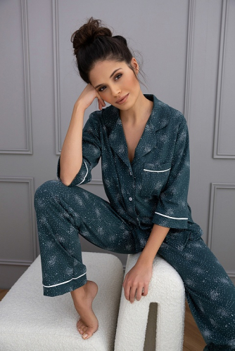 Повседневная пижама Sydney темно-синего цвета состоит из рубашки и прямых брюк. Рубашка на пуговицах, с фигурным воротником и рукавами 3/4. На груди накладной карман. Идеальный вариант не только для сна, но и для домашнего отдыха.