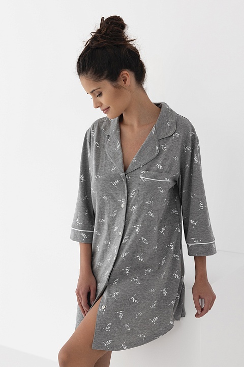 Сорочка Dora рубашечного типа с принтом. Рукава 3/4. Свободный силуэт и длина чуть выше колен. На груди карман в цвет основной ткани. Сорочка застегивается по всей длине.