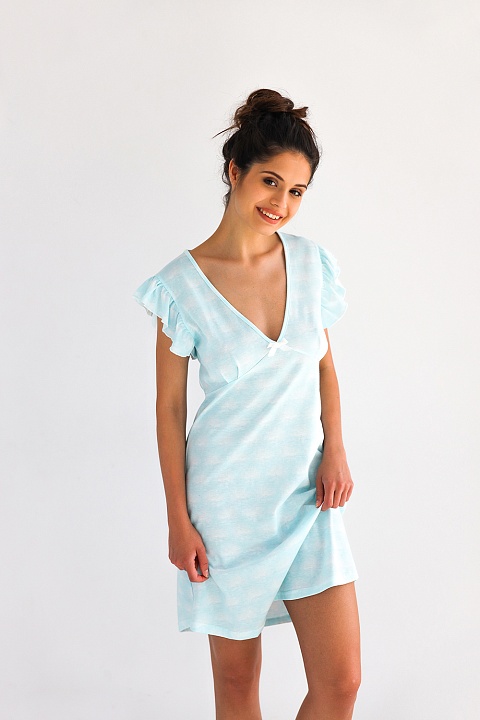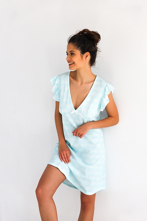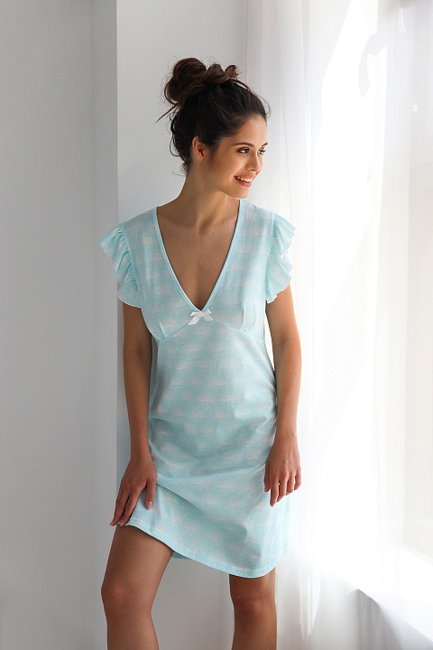 Яркая сорочка Greta с глубоким v-образным вырезом и короткими рукавами-воланами. Крой свободный. На груди декорирована миниатюрным бантиком. Идеально подъодит для сна и домашнего отдыха.