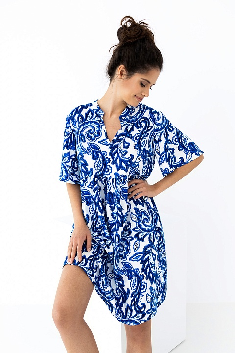 Роскошное домашнее платье Luna с широкими рукавами. Вырез глубокий v-образный, оформлен фигурным воротничком. Материал выполнен с контрастным растительным принтом. Свободный крой и длина чуть выше колен.