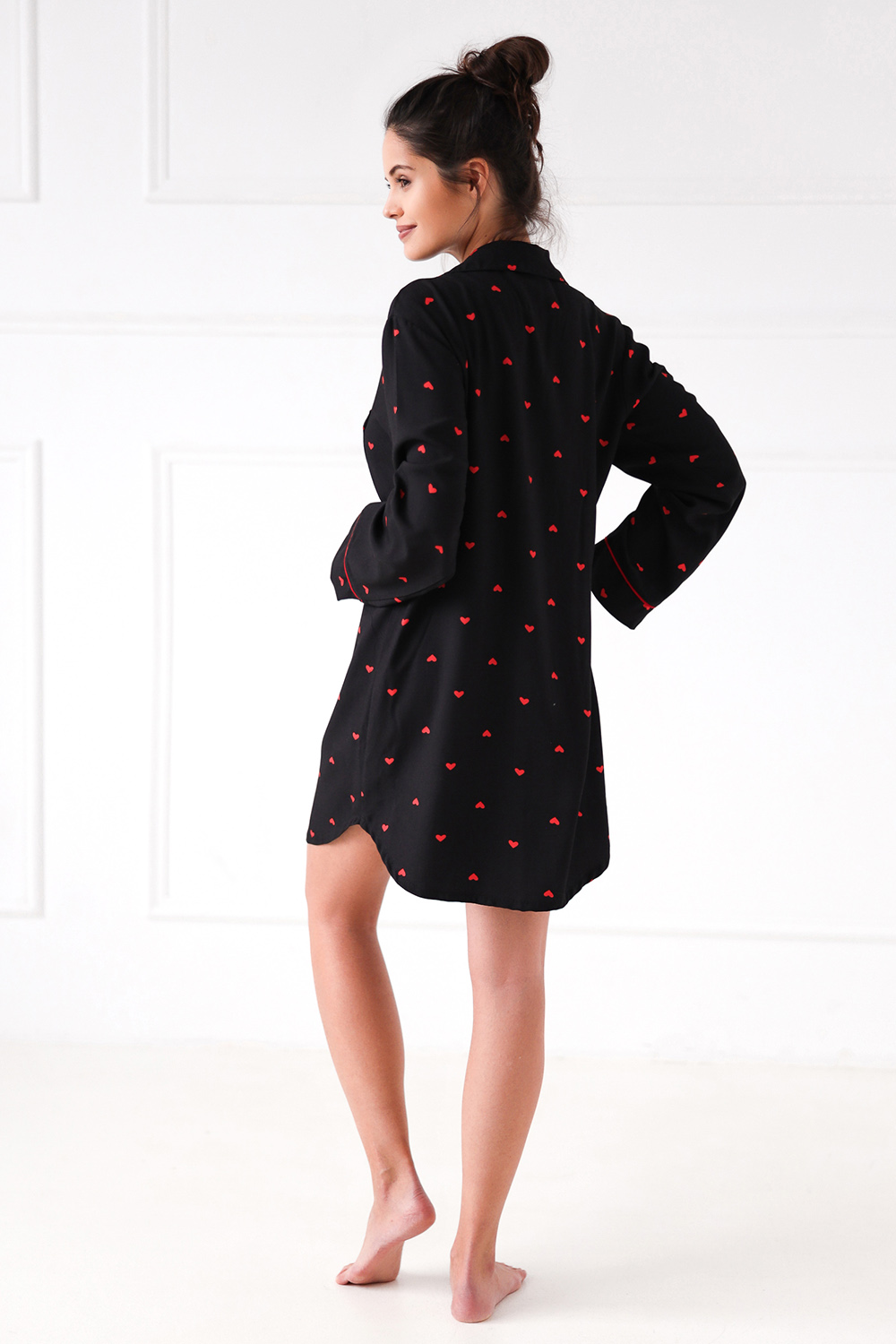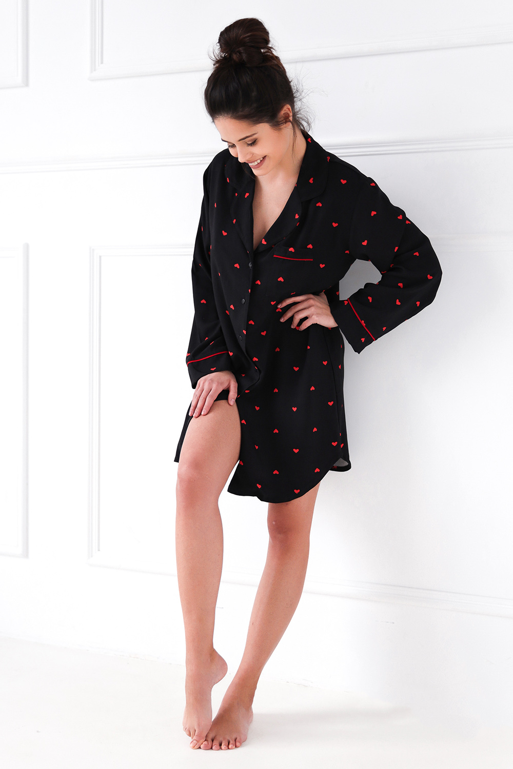 Черная сорочка Rolling in Love с принтом "сердечки". Рукава длинные. Свободный крой и длина чуть выше колен. На рукавах и нагрудном кармашке контрастный кант.