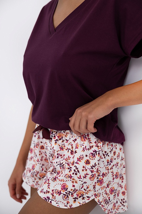 Легкая летняя пижама Marisol состоит из белых шортиков с растительным принтом и футболки свободного кроя. Шорты на широкой резинке, декорированы контрастным бантиком на поясе. Футболка с v-образным вырезом горловины. Идеальный вариант не только для сна, но и для домашнего отдыха.