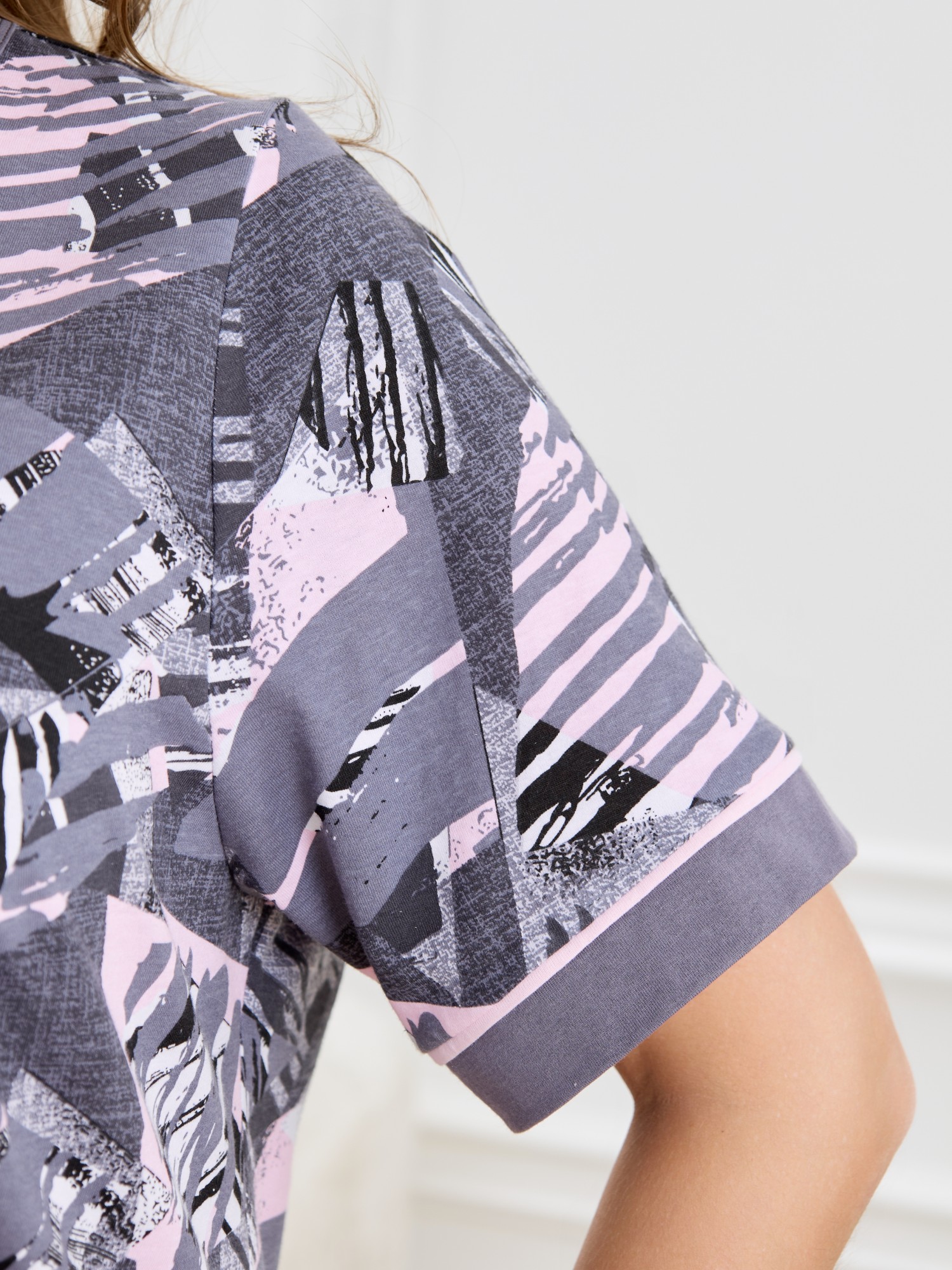 Халат женский из трикотажного полотна «кулирка» с набивным рисунком, прямого силуэта, с короткими втачными рукавами, с горловиной овальной формы, окантованной основным материалом, с рельефами, выходящими из пройм, двумя накладными карманами на уровне бедер и центральной бортовой застежкой на обметанные петли и пуговицы. Нижние срезы рукавов обработаны притачными манжетами, верхние срезы карманов – с притачными планками. В швах соединения манжет и планок с деталями – узкий кант контрастного цвета.