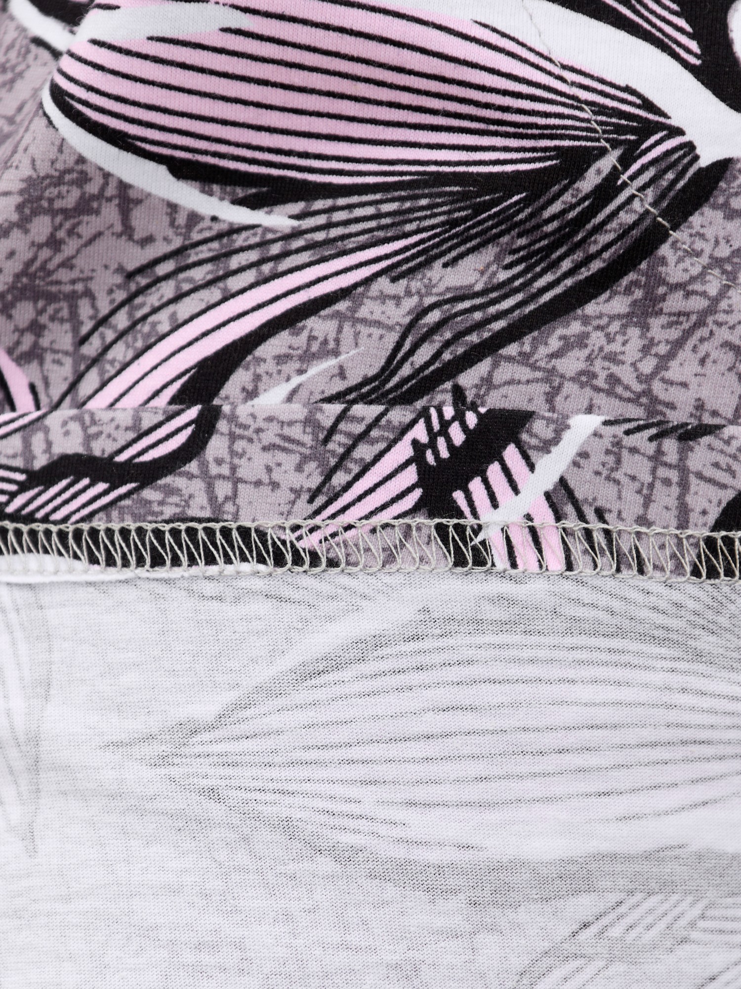 Халат женский из трикотажного полотна «кулирка» с набивным рисунком, прямого силуэта, с короткими втачными рукавами, горловиной овальной формы, карманами в боковых швах и центральной бортовой застежкой на тесьму «молния». Бортовые срезы, горловина и входы в карманы окантованы контрастным материалом.