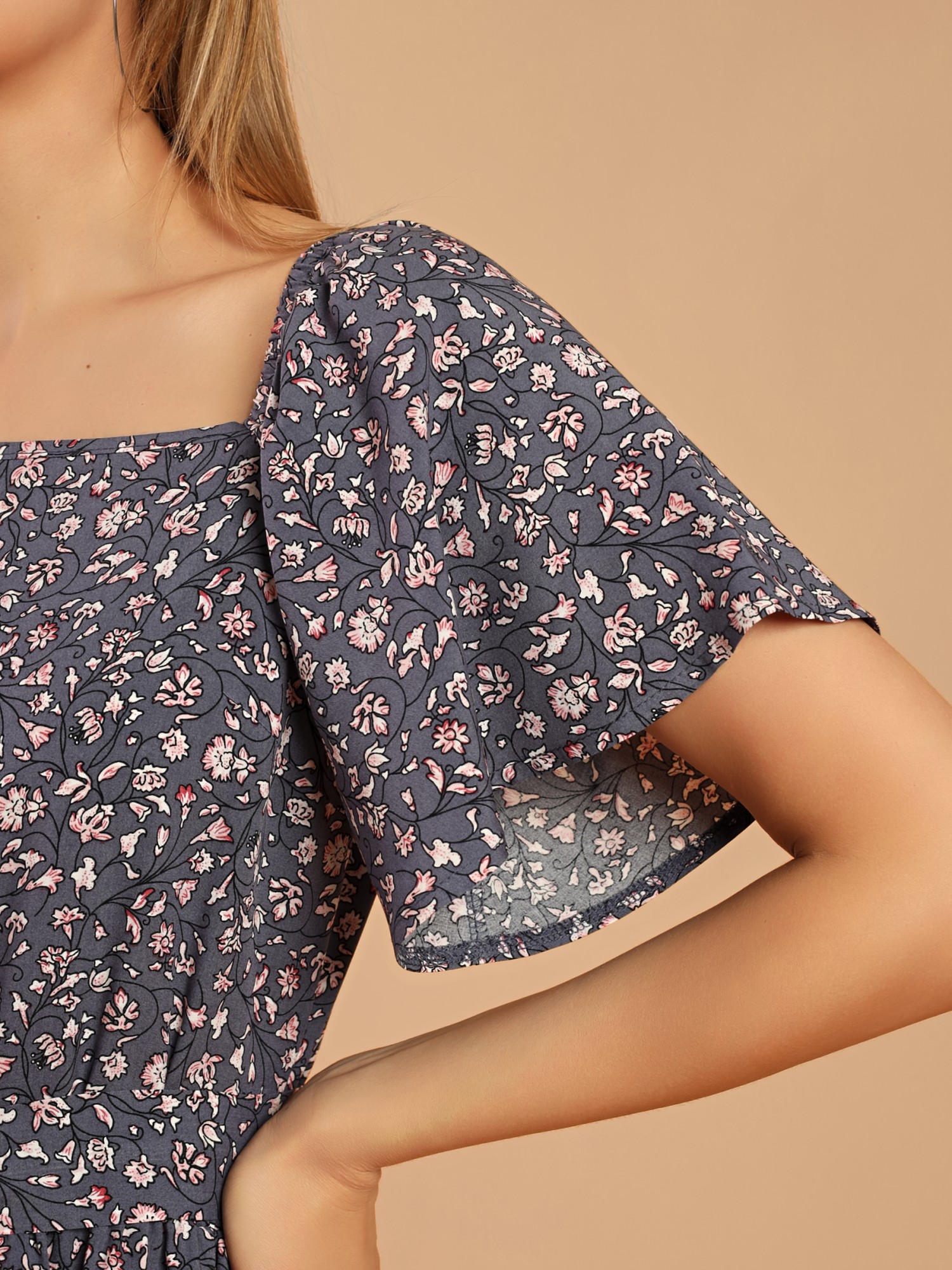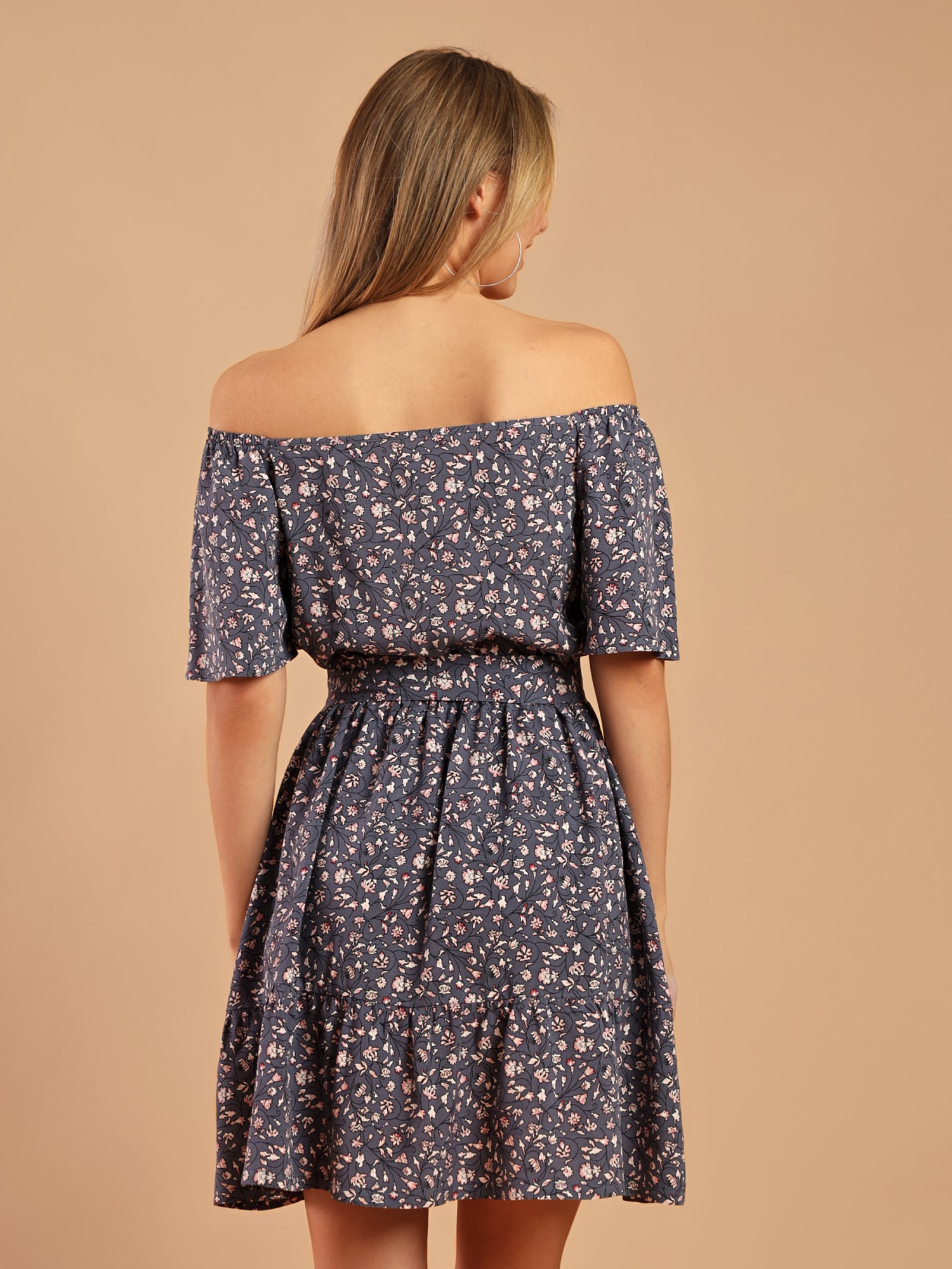 Платье молодежное из тканого полотна «штапель» с набивным рисунком, длиной до колена, свободного покроя, отрезное по линии талии, вытачками в области груди, с широкими рукавами на основе «реглан». Горловина прямоугольной формы – расширенная и углубленная. Рукава присборены по верхним срезам при помощи эластичной тесьмы в краевых швах. Верхние срезы спинки и полочек, образующие горловину, окантованы основным материалом. Юбка присборена по швам соединения с лифом с помощью эластичной тесьмы, понизу - оборка. Изделие комплектуется съемным поясом, завязывающимся на талии.