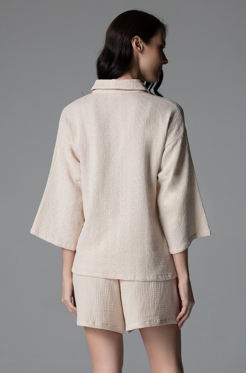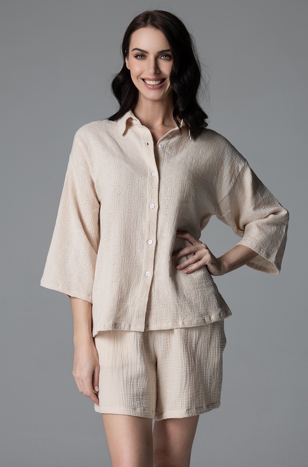 Комплект Mia-Amore состоит из рубашки с коротким рукавом и шорт, выполнен из однотонного хлопкового муслина с вышивкой. По бокам шорт обработаны карманы.