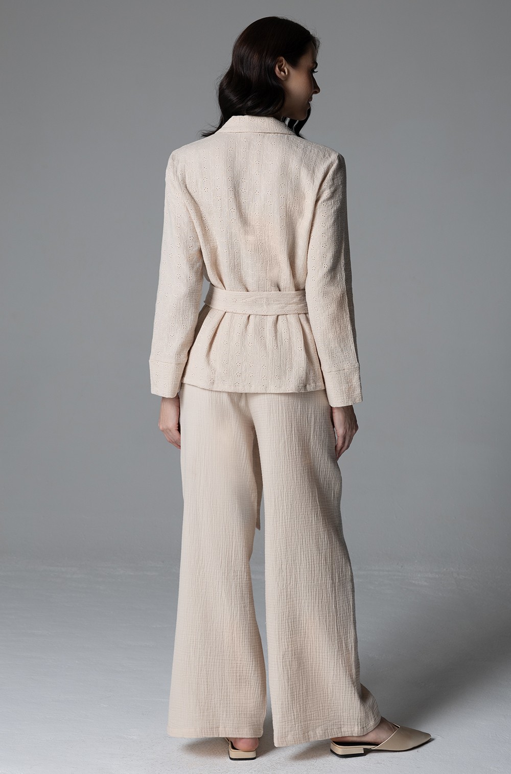Комплект Mia-Amore состоит из жакета на пуговицах, с длинными рукавами и брюк, выполнен из однотонного хлопкового муслина с вышивкой. Брюки на эластичном поясе с боковыми карманами, в комплект входит пояс.