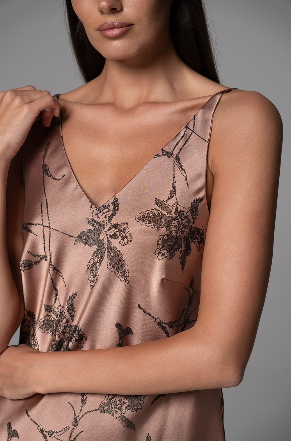 Короткая сорочка Mia-Amore без подреза на тонких регулируемых бретелях выполнена из жаккардового двухцветного смесового шёлка. Спереди по лифу V-образный вырез головины, на спинке классические тонкие бретели.