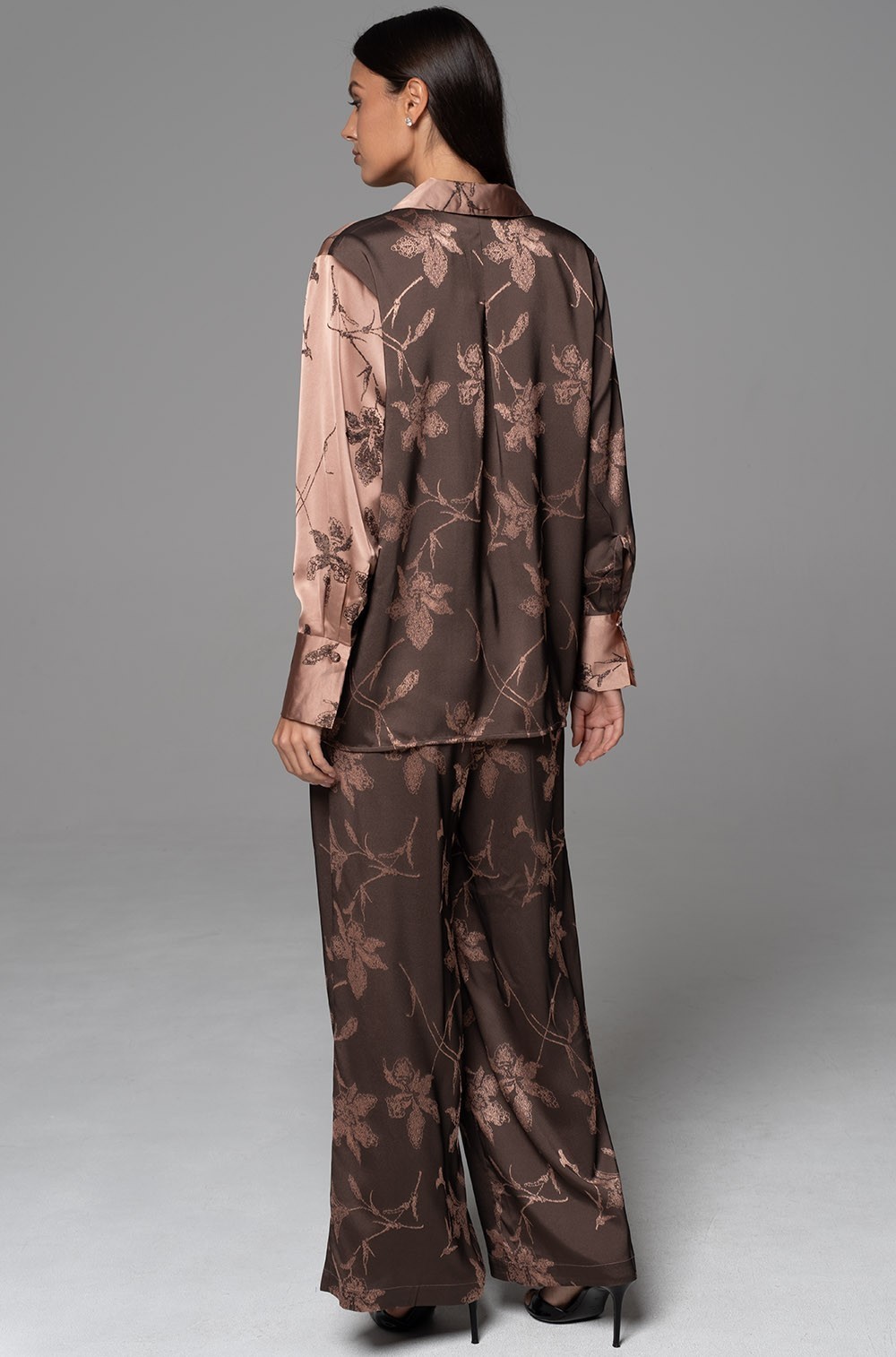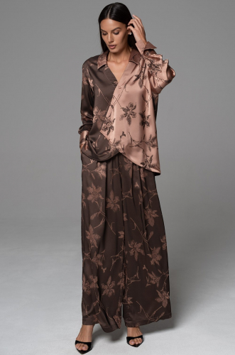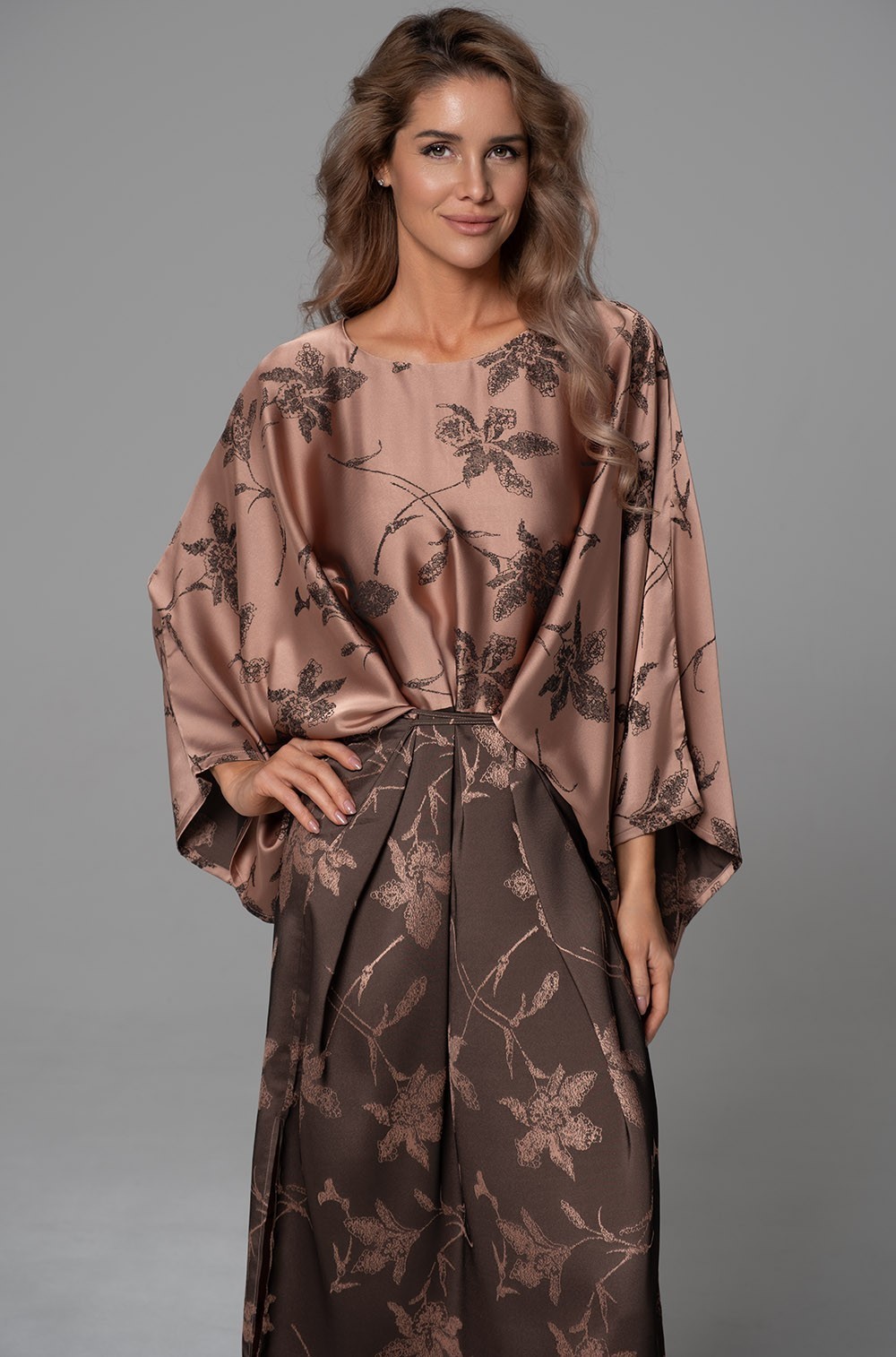Туника свободного силуэта Mia-Amore ниже колен, с O-образным вырезом горловины выполнена из жаккардового двухцветного смесового шёлка. Верхняя часть выполнена из светлого жаккарда, нижняя часть - из тёмного шёлка. По талии туника приталена с помощью вшитых завязок.