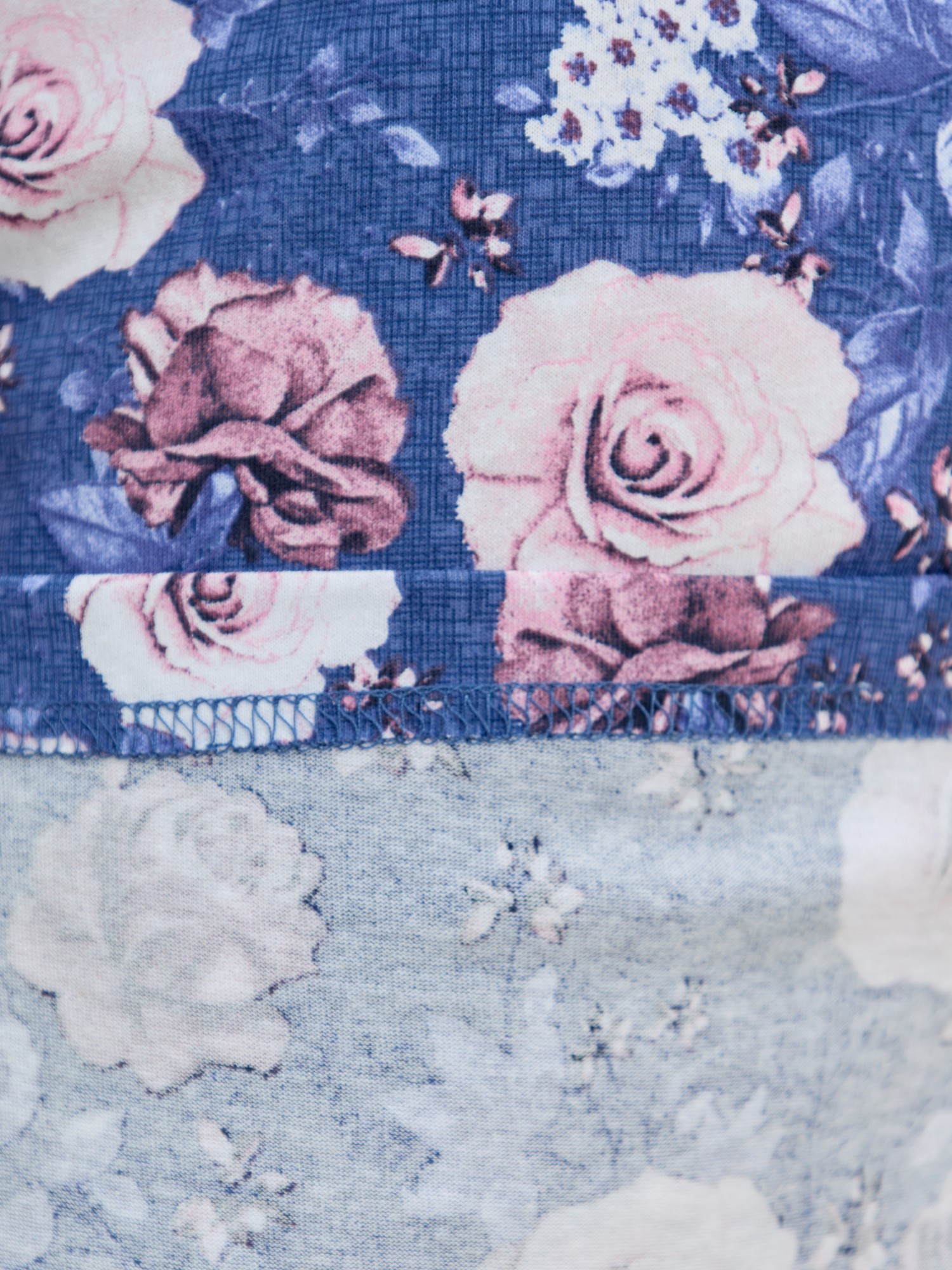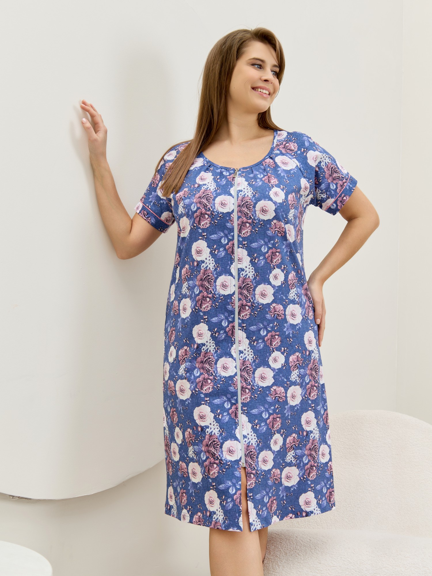 Халат женский из гладкокрашенного трикотажно полотна «кулирка» с набивным рисунком, полуприталенного силуэта, с короткими рукавами покроя «реглан» и горловиной овальной формы, окантованной основным материалом, с центральной бортовой застежкой на тесьму «молния». По срезу горловины выполнены неглубокие складки, нижние резы рукавов обработаны притачными манжетами с кантом контрастного цвета.