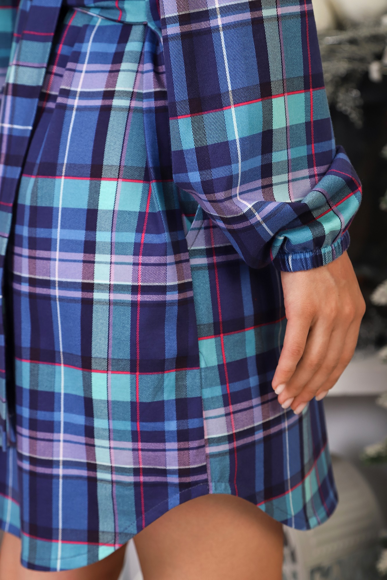 Халат из трикотажного полотна «кулирка» с набивным рисунком, прямого силуэта, с длинными втачными рукавами, стояче-отложным воротником, карманами в боковых швах и центральной бортовой застежкой на петли и пуговицы, с фигурной линией низа. Низ рукавов обработан эластичной тесьмой, в боковые швы на уровне линии талии втачаны концы двух широких завязывающихся спереди полупоясов.