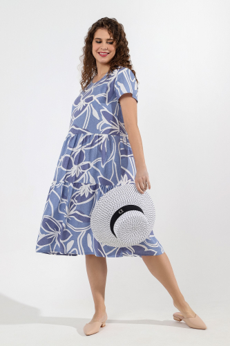 Сарафан женский из тканого штапельного полотна с набивным рисунком, удлиненное свободного силуэта, без рукавов, с рельефными швами, выходящими из пройм. По нижнему косому срезу притачная оборка и разрез в левом рельефном шве. Проймы и V-образная горловина окантованы основным материалом.