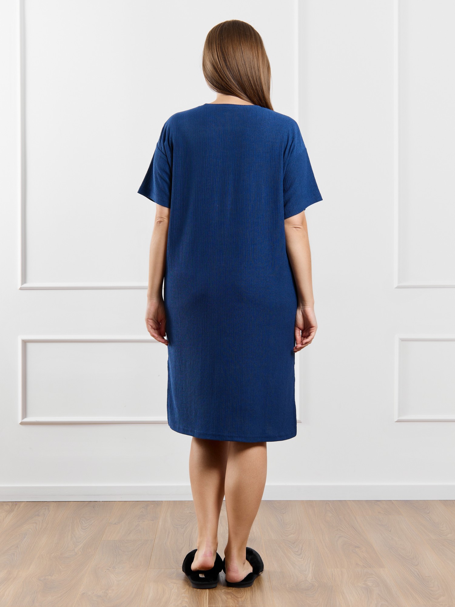 Туника женская из гладкокрашенного трикотажного полотна «бурумчук», прямого силуэта, с короткими втачными рукавами, горловиной овальной формы, обработанной втачной планкой, с разрезами в боковых швах. По центру полочки ниже горловины - настрочен декоративный элемент-нашивка.
