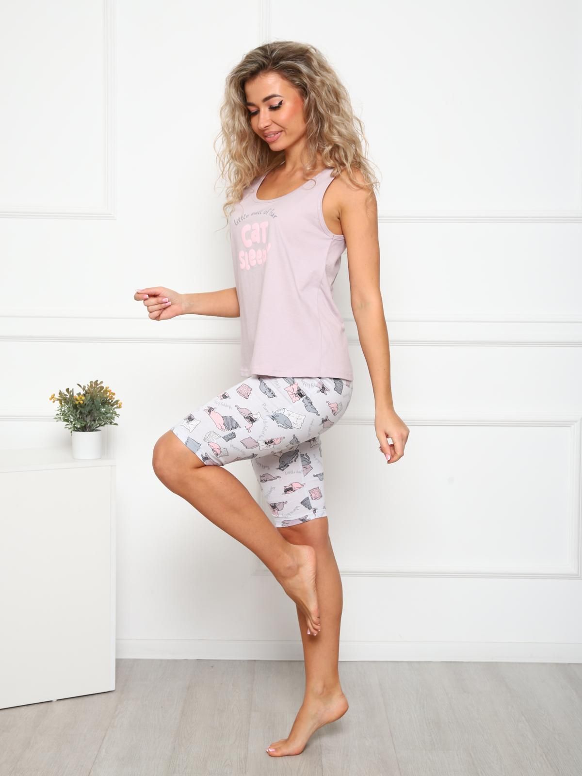 Пижама "Слипинг кэтс" из трикотажного полотна "кулирка" состоит из майки и велосипедок. Майка из гладкокрашеного трикотажного полотна "кулирка" полуприлегающего силуэта с круглым вырезом горловины на широких бретелях. Вырез горловины и проймы обработаны кантом из основной ткани. Майка украшена модным принтом. Велосипедки - классического кроя из трикотажного полотна с набивным рисунком с цельнокроеным поясом с эластичной лентой.
