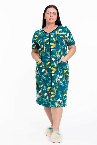 Женский халат из кулирки с набивным рисунком — практичный и удобный вариант для дома. Модель прямого кроя с короткими рукавами и круглым вырезом горловины подчёркивает женственность и обеспечивает свободу движений. Застёжка на молнии делает халат удобным в использовании, а накладные карманы добавляют функциональности. Контрастная бейка по горловине и бортам служит стильным акцентом. Натуральное хлопковое полотно приятно к телу и дарит комфорт в течение всего дня.