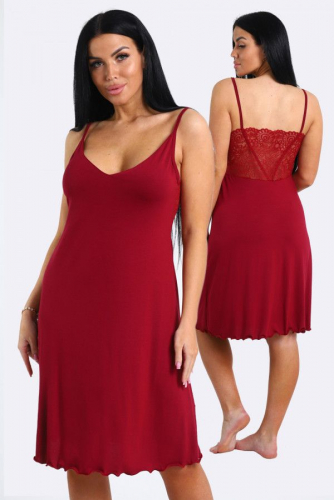 Сорочка ночная с эластичным кружевом из однотонной вискозы. Изящная модель на узких бретелях, с кружевом чуть ниже груди и  разрезом на передней полочке. Декольте, разрез и низ сорочки обработаны волнистым краем. Сорочка уютная, комфортная для сна.