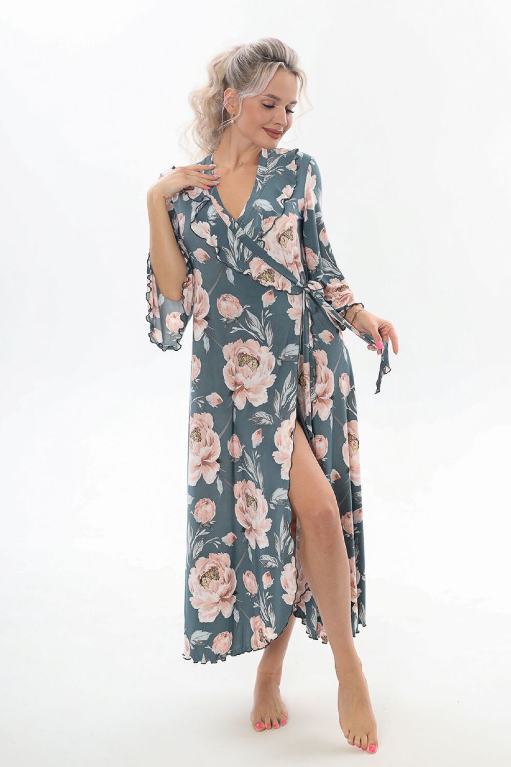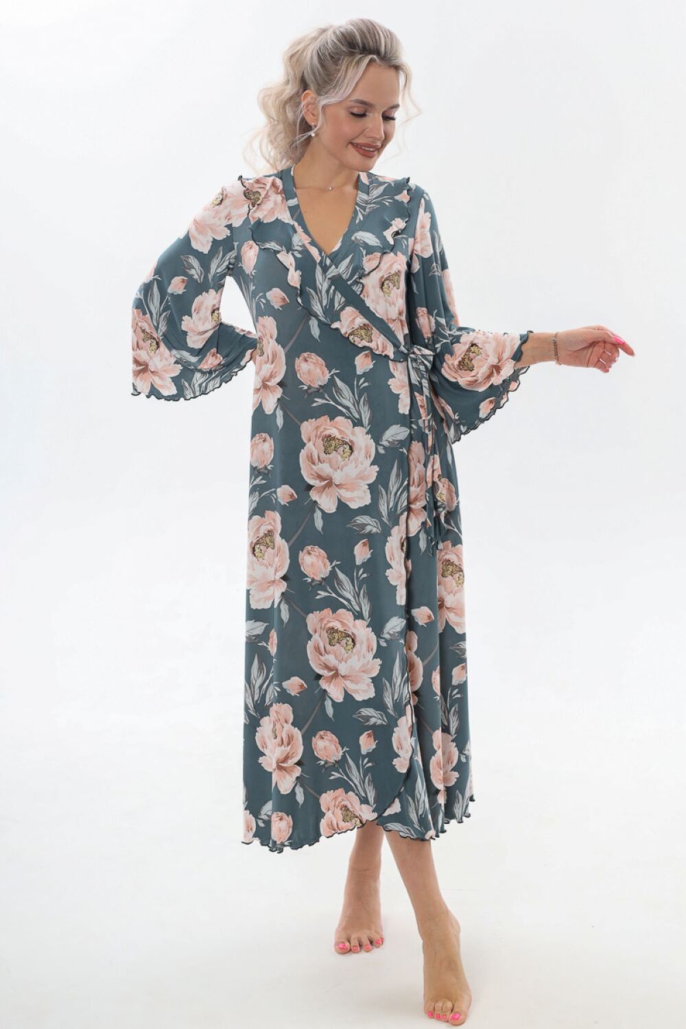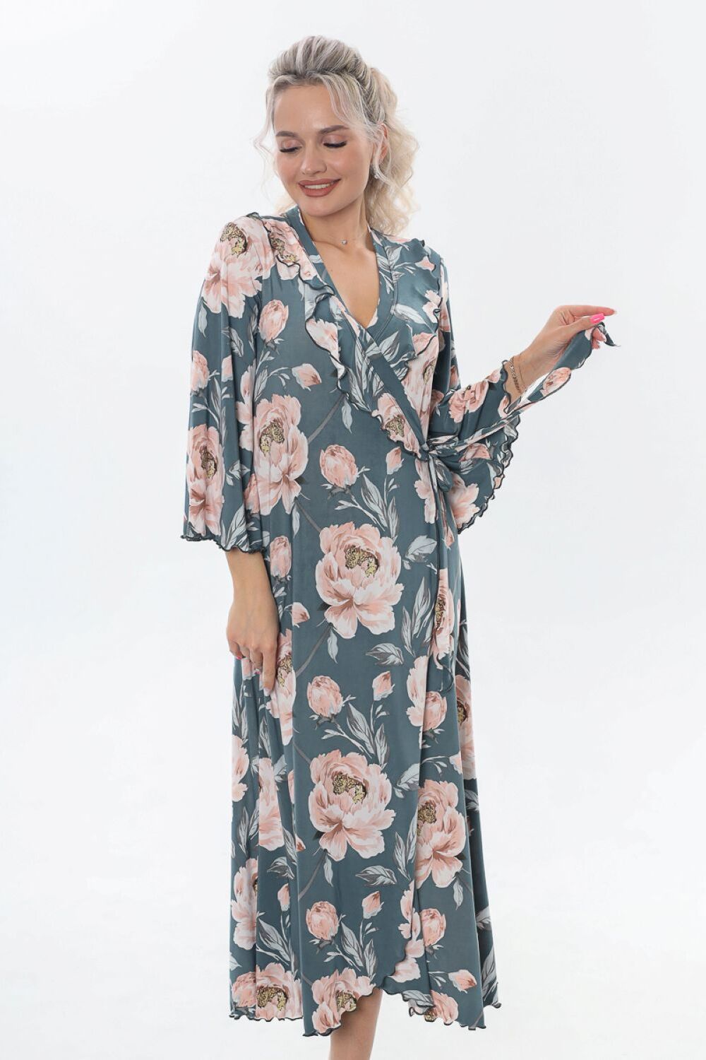 Халат домашний трикотажный женский - это отличное дополнение к вашей коллекции одежды для дома, созданной для тех, кто любит быть яркой и стильной, даже находясь в уютном уголке своего дома. Длинный халат с запахом имеет полуприлегающий силуэт, расклешенный к низу, длиной до середины икры. Линия талии завышена, что создает элегантный и изящный силуэт. На полочках, в области груди, расположены изящные воланы, которые добавляют изюминку к образу, подчеркивая женственность. Рукав в тачной, длиной 3/4, смотрится легко и элегантно, это делает его удобным в использовании. Подойдет как стройным женщинам, так и дамам с пышными формами. Возьмите халатик в роддом и будете самой элегантной мамочкой. Наш халат это идеальный выбор для приятного времяпрепровождения в уютной обстановке. Сочетая в себе красоту и удобство, он идеально подходит для женщин, которые ценят качество во всем. Цвет: серо-розовый; Материал: полиэстер;полиэстер; Состав: 95%полиэстер.5%эластан.