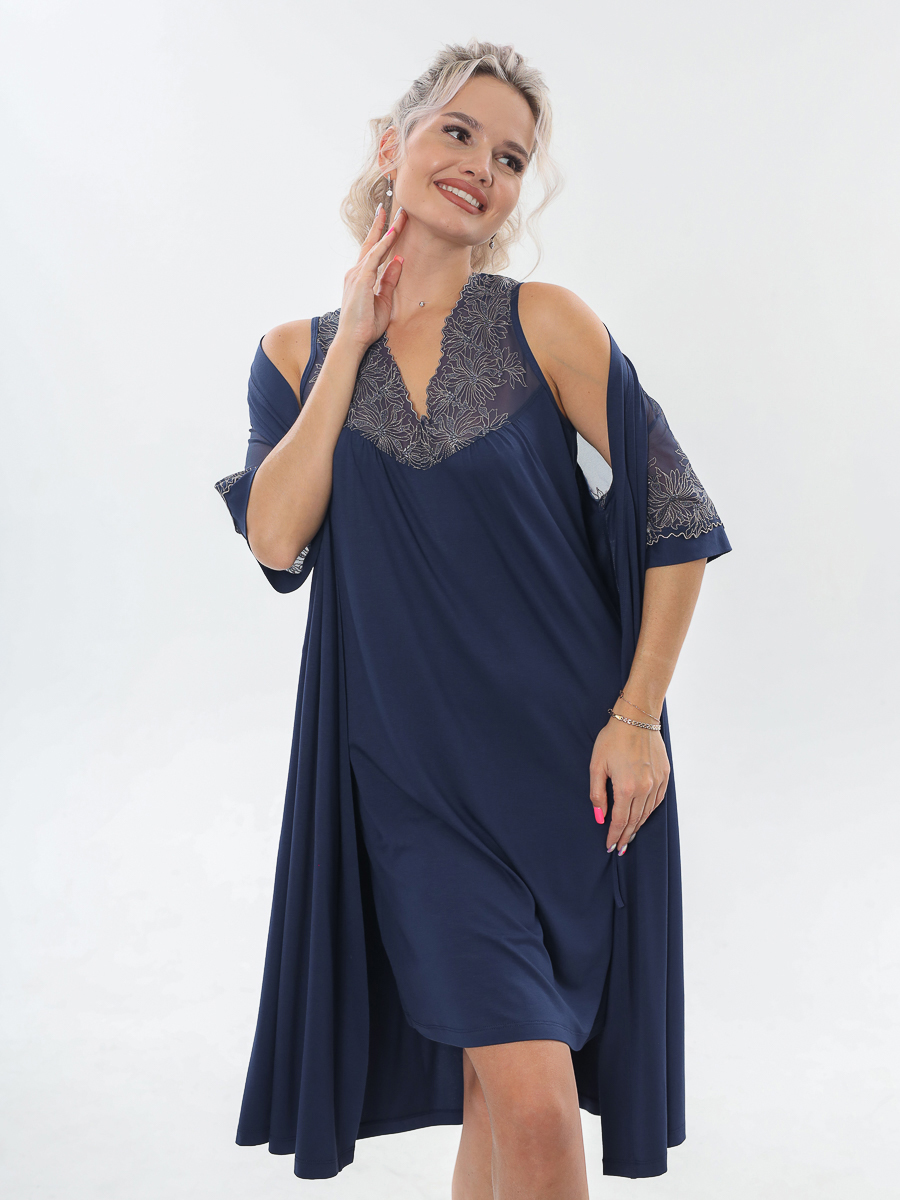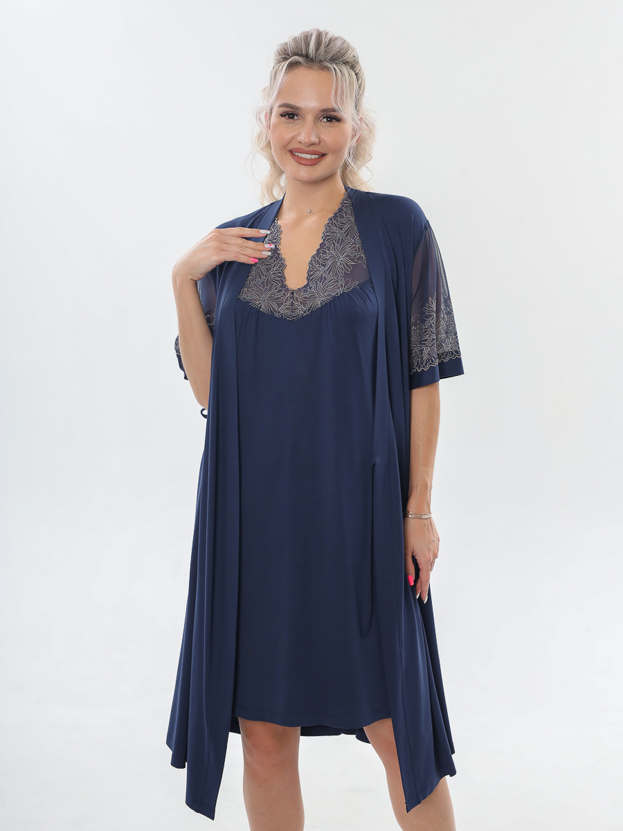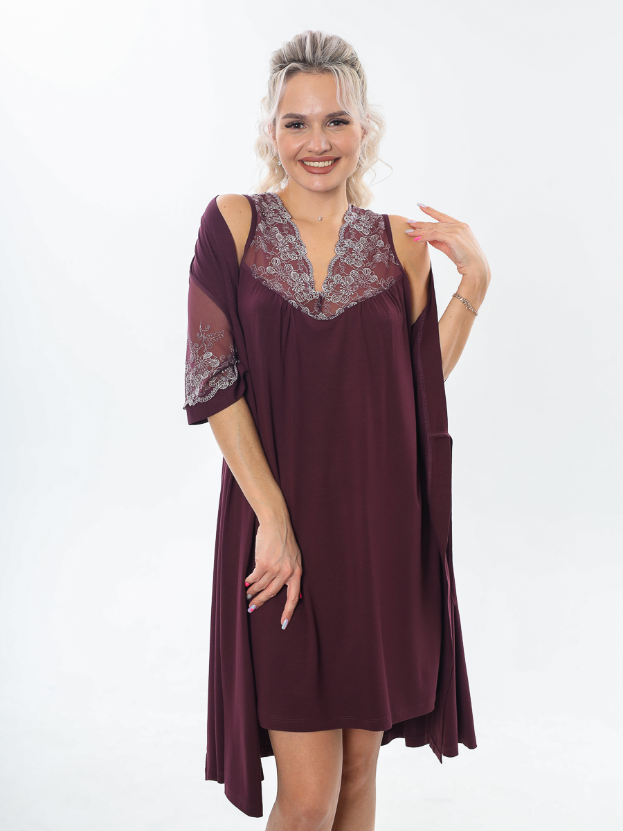 Кружевной трикотажный пеньюар - идеальный выбор для комфортного и элегантного отдыха дома. Изготовлен из высококачественной вискозы. Сорочка длинною до колена, вверх изделия украшен изысканным кружевом на сетке премиум качества. Халат, длиной за колено, с запахом, короткие рукава из сетки с кружевом добавляют нотку романтики и женственности. Модель пеньюара подходит для женщин с большими размерами и беременным, благодаря отличной тянущейся вискозе, которая обеспечивает идеальное прилегание и свободу движений. Простота и лаконичность дизайна этого комплекта прекрасно сочетаются с изысканностью и стилем, делая его незаменимым атрибутом вашего гардероба для специальных моментов отдыха или для повседневного использования. Цвет: бордовый;розовый;синий;сиреневый; Материал: вискоза;вискоза; Состав: 92% вискоза, 8% эластан.