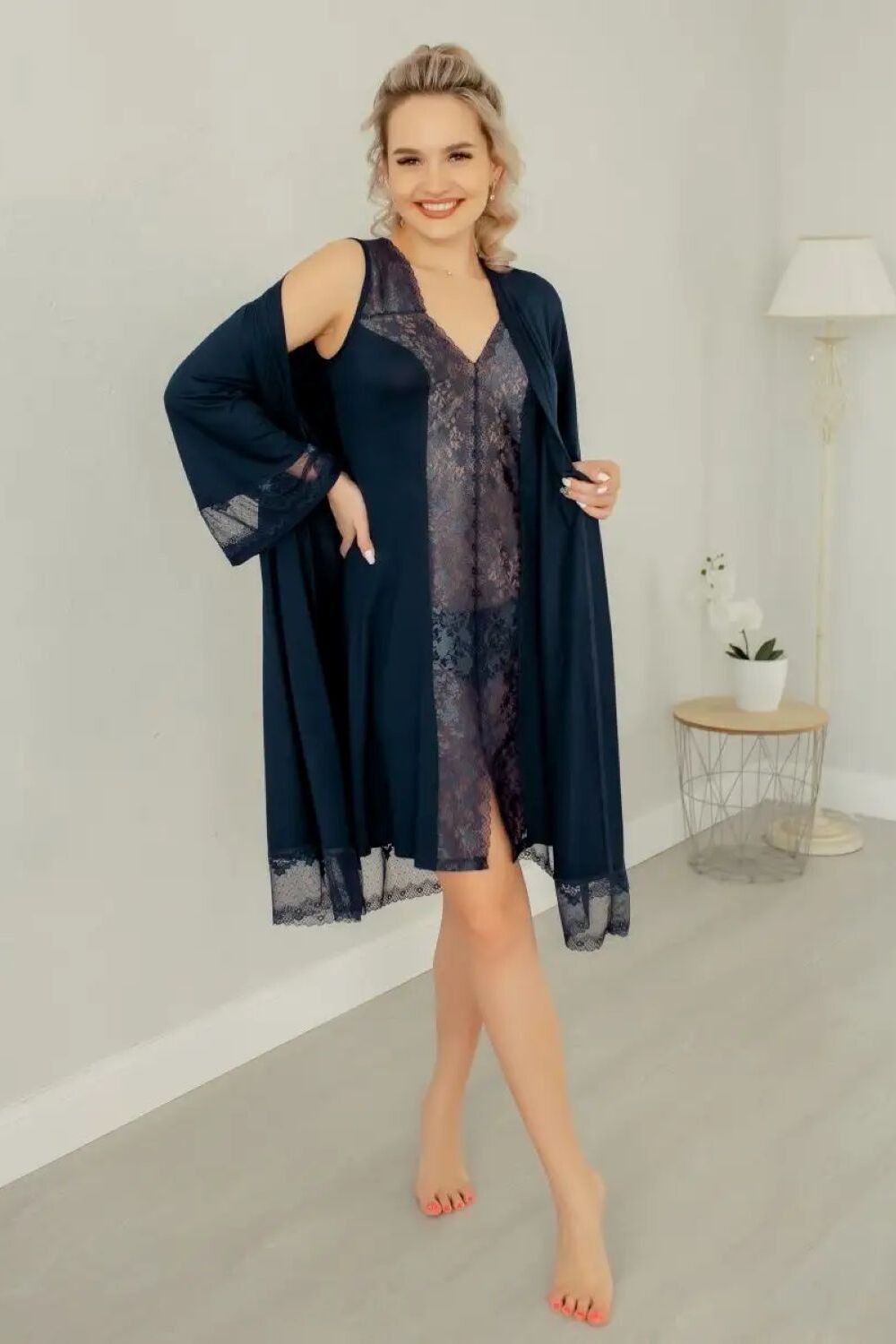 Комплект женский кружевной из вискозы состоит из халата и сорочки. Сексуальный пеньюар из вискозы с эластичным кружевом. Халат полуприлегающего силуэта, длинною ниже колена, на запах, с застежкой на полу держатели и пояс. Низ халата и рукавов украшены эластичным кружевом. Сорочка прилегающего силуэта длинною выше колена, эффектно декорирована кружевом. Комплект выполнен из комфортной к телу вискозы и представлен большим размерным рядом. Кокетливый разрез на сорочке добавит Вашему образу больше женственности и сексуальности. Комплект подойдет и стройным девушкам, и статным дамам.