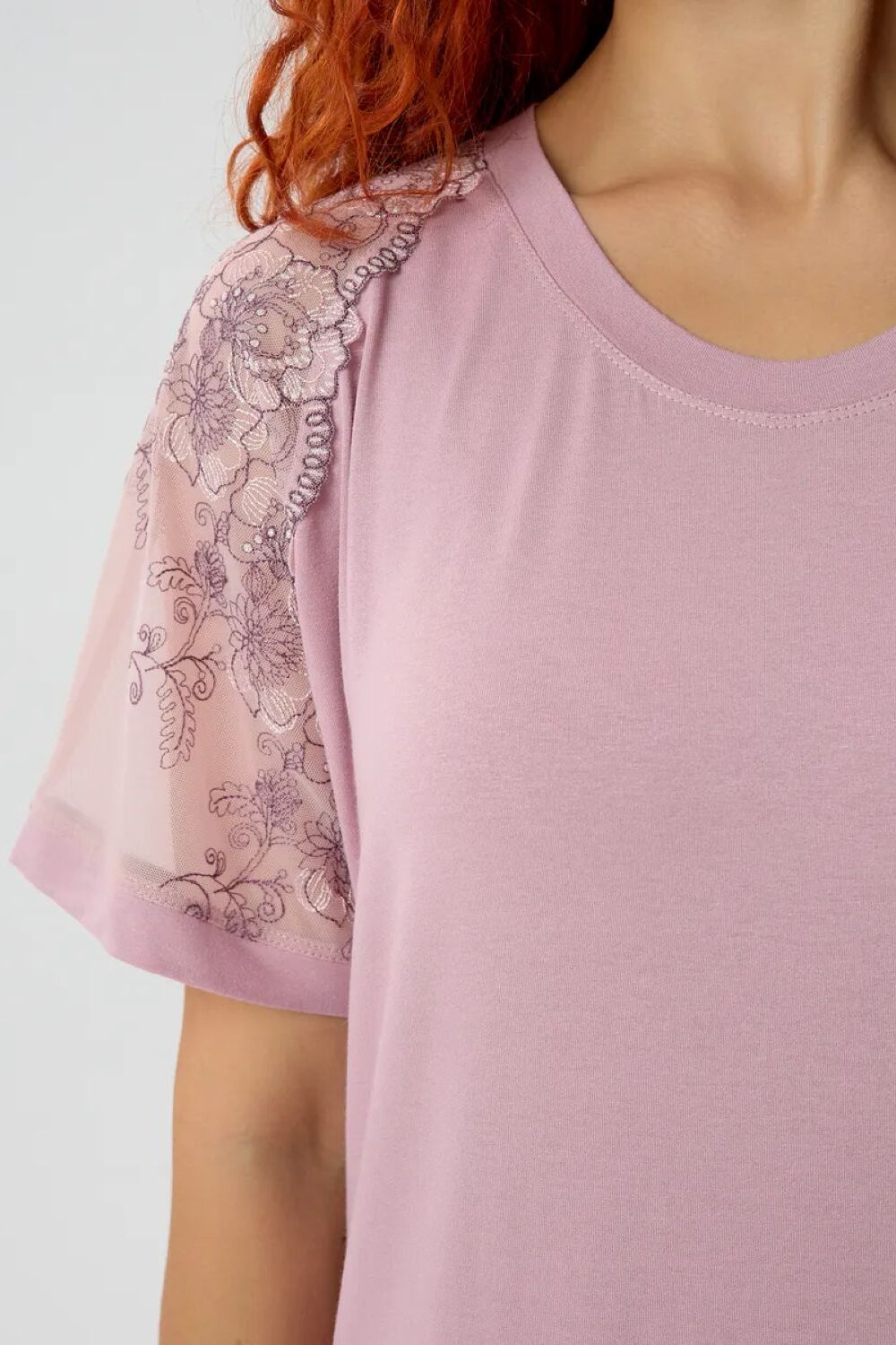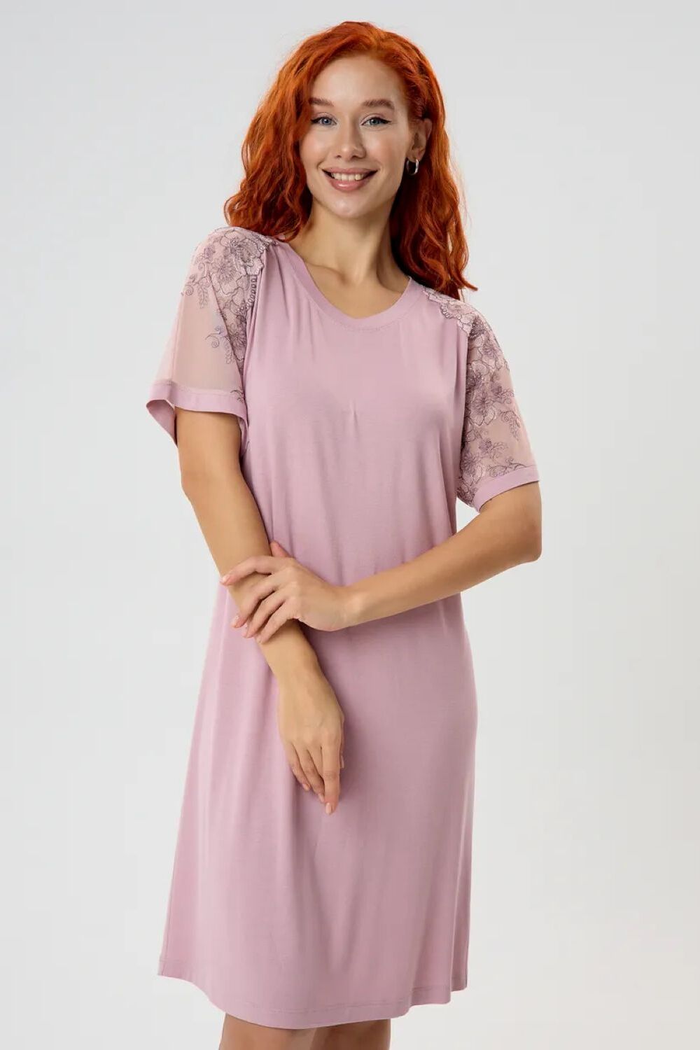 Ночная сорочка из вискозы станет незаменимой частью вашего гардероба для комфортного и стильного отдыха. Длина изделия чуть ниже колена обеспечивает оптимальное удобство и свободу движений, а округлый вырез горловины придает образу мягкость и женственность. Особое внимание привлекают рукава реглан, выполненные из эффектного кружева на сетке, добавляющие сорочке нотку романтичности и изящества. Свободный крой позволяет носить сорочку как будущим мамам, так и всем, кто ценит комфорт в сочетании с элегантностью. Большой размерный ряд позволит каждой женщине найти идеальный вариант, а трикотажная текстура ткани гарантирует идеальную посадку, благодаря своей способности хорошо тянуться и адаптироваться к особенностям фигуры. Цвет: розовый; Материал: вискоза;вискоза; Состав: 92 % вискоза, 8 % эластан.