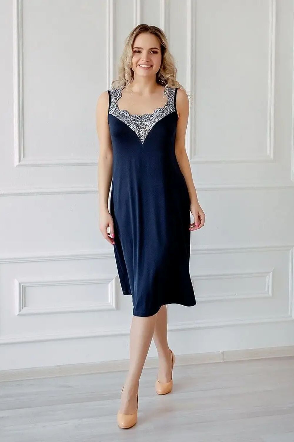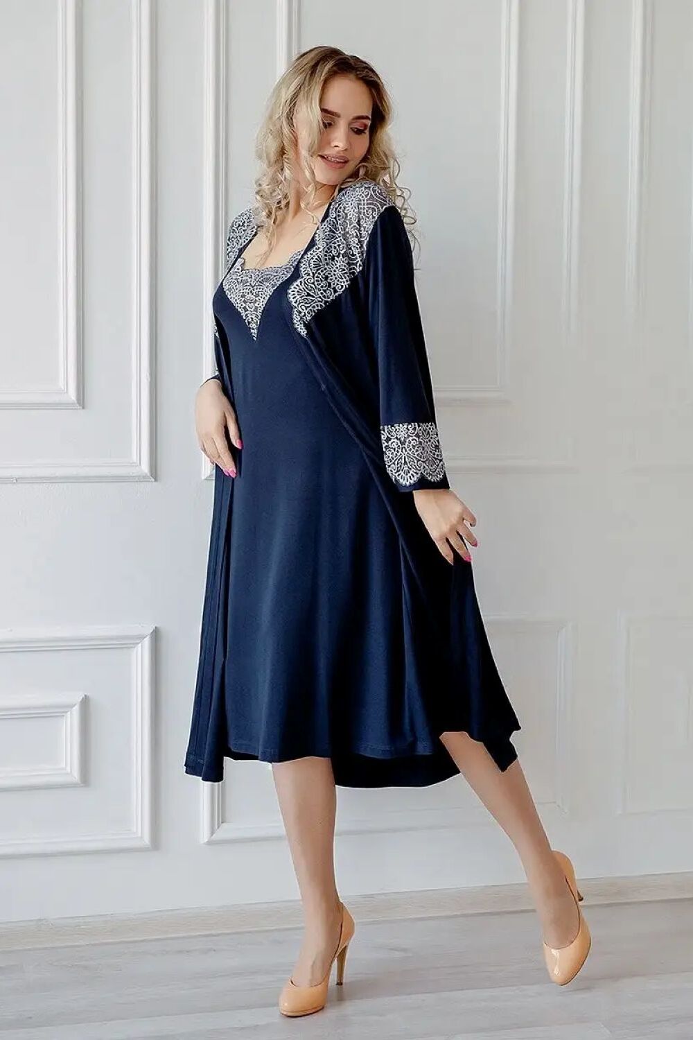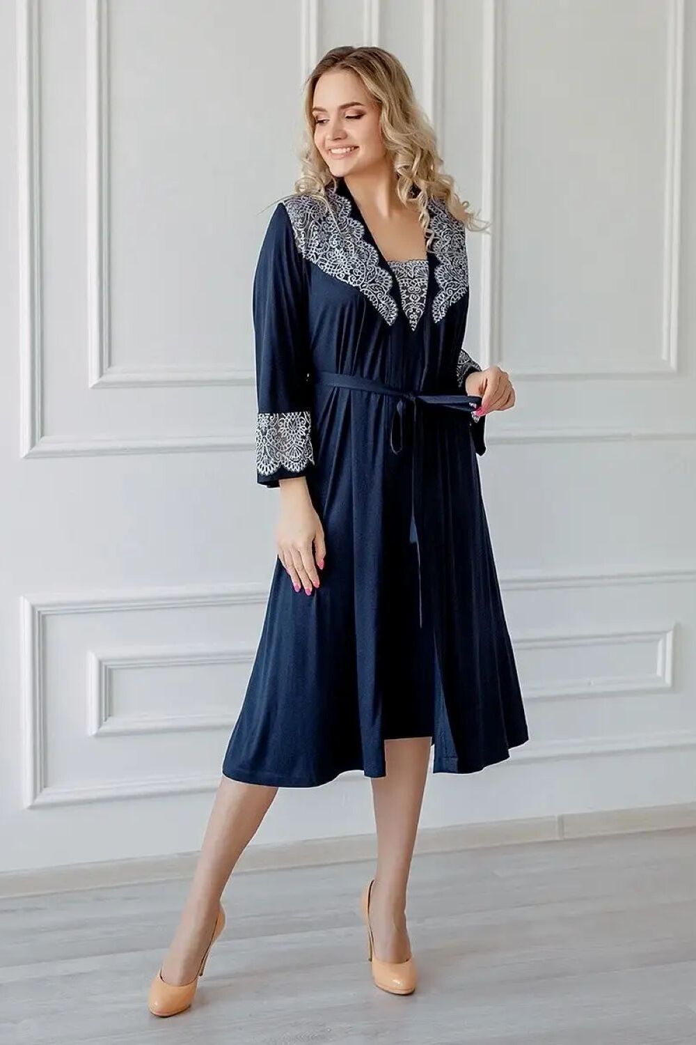 Пеньюар женский длинный кружевной, сексуальный. В комплект домашний входят халат, пояс и длинная сорочка. Сорочка свободного силуэта, длинною ниже колена, спереди украшена эластичным кружевом, линии кроя подчёркивают линию груди, модель очень удобная и при этом эффектно смотрится. Халат(пеньюар) запашной, , свободного силуэта, с застежкой на пояс. Повседневный набор с рубашкой выполнен из высококачественного вискозного трикотажа, который по тактильным ощущениям такой же нежный, как хлопок. Но в отличие от хлопкового материала, более долговечен и прост в уходе. Натуральный состав набора позволяет ощущать себя комфортно весной, летом и в холодные зимние ночи. Эластичная материя тянется, что оптимально для беременных, рожениц и будущих мам. Возьмите пижаму с собой в больницу или роддом и будите самой привлекательной мамочкой. Трикотажная ночнушка на широких бретельках выглядит как вечернее платье, а женственный халатик с запахом завершает образ. Носить его можно отдельно. Накиньте его поверх комбинации или на нарядное нижнее белье. Идеально смотрится как на высоких, так и на невысоких девушках. Отлично сидит на худеньких подростках. Цвет: синий; Материал: вискоза;вискоза; Состав: 92% вискоза, 8% эластан.