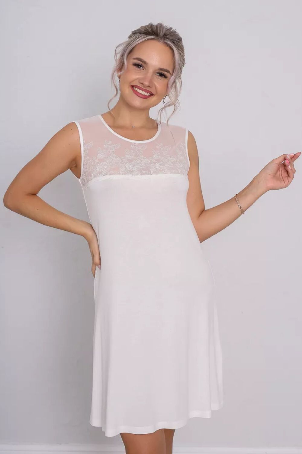 Ночная сорочка женская без рукава - идеальное решение для женщин и девушек, которые ценят комфорт и стиль. Ночнушка короткая, выполнена из вискозного полотна, состав ткани (92 % вискоза и 8% эластан) и обеспечивает оптимальный уровень воздухопроницаемости, позволяя коже дышать во время сна. Главная особенность этой сорочки - вырез горловины с округлой формой, который украшен сеткой, выполненной из высококачественного кружева премиум класса и прекрасно подчеркнет Вашу женственность. Это добавляет ночнушке нежности и элегантности, придавая Вам роскошный и соблазнительный образ. Сорочка предлагается в больших размерах, чтобы каждая женщина смогла найти свой идеальный вариант. Она идеально сочетается с любым типом фигуры, подчеркивая все ваши достоинства и скрывая недостатки. Погрузитесь в мир комфорта и стиля с этой рубашкой больших размеров. Она станет вашим незаменимым спутником для приятных и уютных моментов перед сном или утренних часов отдыха. Стильная, эротичная и сексуальная спальная вещь для дома. Подойдёт на любой рост: для высоких, для невысоких и дам среднего роста.