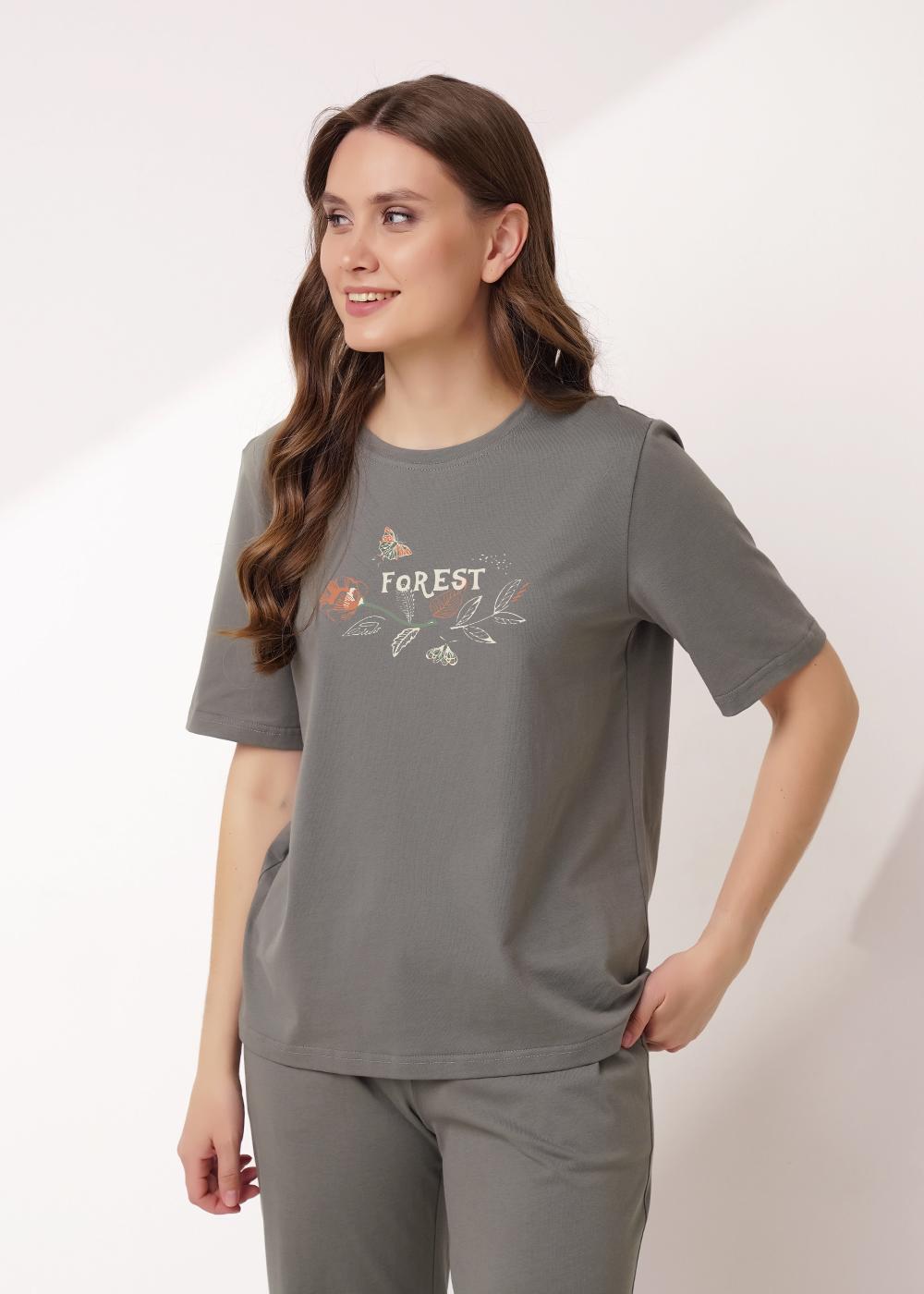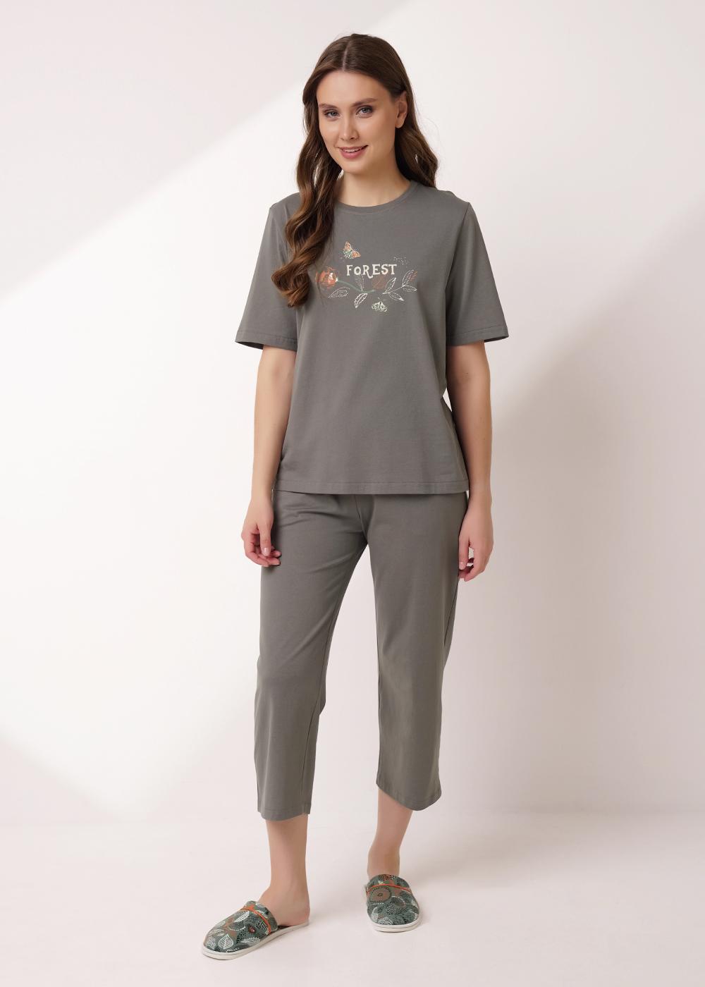 Пижама для дома и отдыха из хлопкового трикотажного полотна. Футболка прямого кроя, округлая горловина с обтачкой. Короткий втачной рукав. На детали переда принт. Бриджы свободного кроя, пояс на внутренней резинке. Боковые карманы с отрезным бочком.