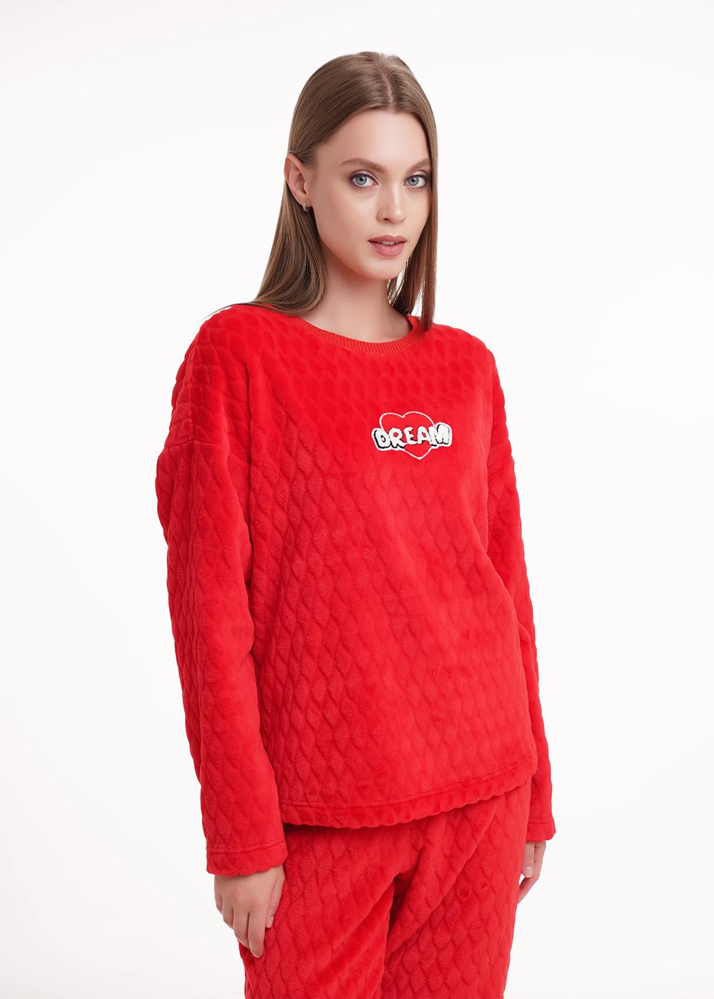 Комплект для дома и отдыха из фактурного трикотажного полотна велсофт. Джемпер прямого силуэта. Длинный втачной рукав. Округлая горловина с вязаной обтачкой. Спереди нашивка. Брюки прямые на внутренней резинке.