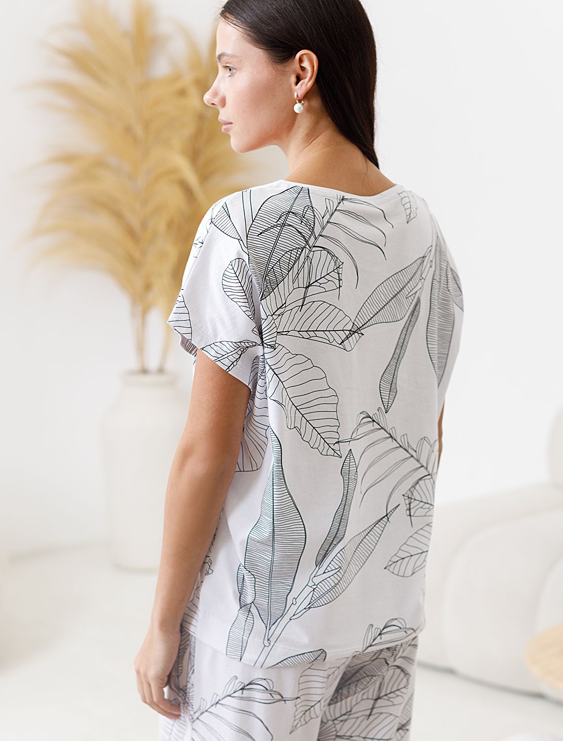Свободная футболка белого цвета с V-вырезом и цельнокроеным рукавом из натурального 100% хлопка создает красивый и легкий образ для дома и отдыха. Дышащая ткань бережно заботится о коже, в то время как декольте с V-вырезом утонченно подчеркивает линию шеи, а свободный крой скрывает возможные недостатки фигуры. Принт в виде листьев добавляет повседневной футболке оригинальности и актуальности для любой домашней обстановки. Такая футболка отлично подойдет для тех, кто ценит комфорт и стиль одновременно. Благодаря натуральной хлопковой ткани, она идеально подходит для ежедневного использования, обеспечивая чувство легкости и свободы движений. Легкая структура материала поддерживает оптимальный микроклимат, что важно при длительном использовании. Эта футболка женственно смотрится и дарит ощущение уюта, делая ее необходимым элементом домашнего гардероба.