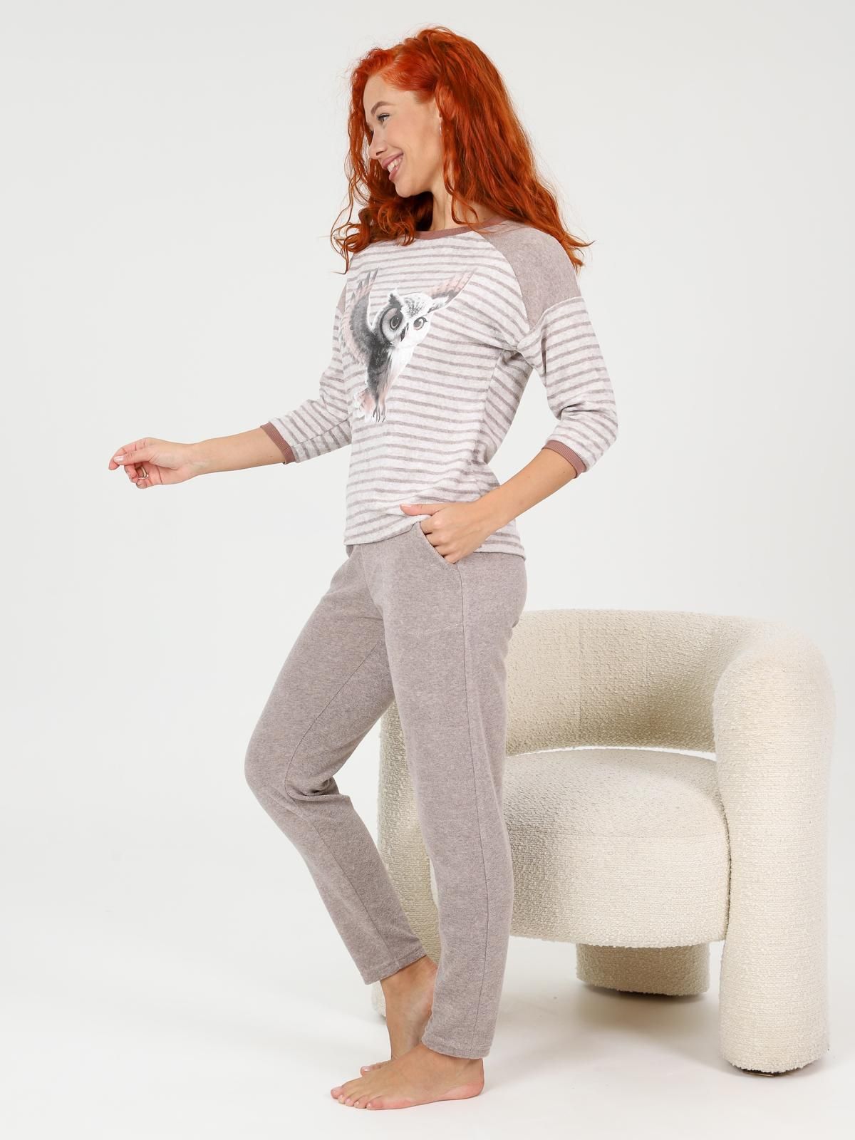 Пижама состоит из кофточки и брюк. Брюки с карманами в боковых швах. Верх на резинке. Кофточка прямого силуэта. Рукав длиной 3/4. Манжет рукава и планка горловины из эластичной рибаны.