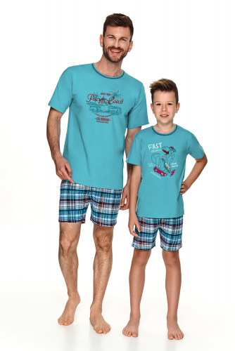 Пижама из хлопка Kalina. Однотонная футболка с принтом на груди и брюки с принтом. Футболка с коротким рукавом и круглым вырезом горла. Брюки с мягкой резинкой в поясе и удобными боковыми карманами. Идеально подходит для сна и в качестве домашнего комплекта.
