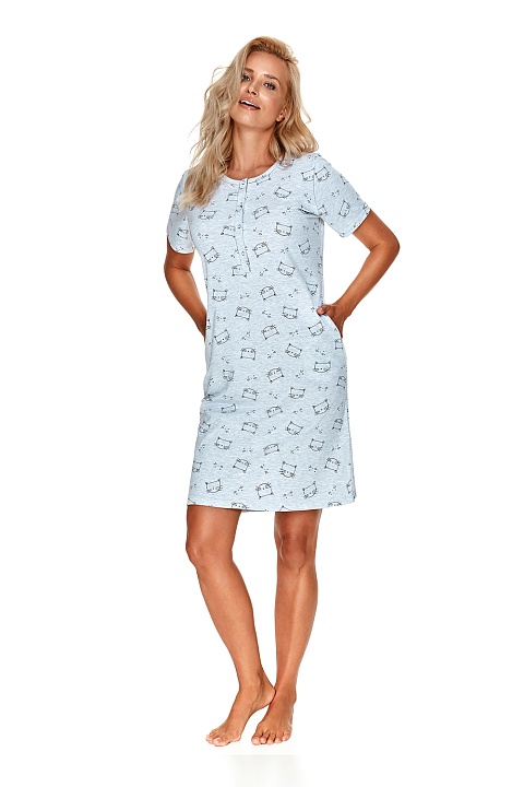 Комфортная женская сорочка Katia. Сорочка выполнена из хлопкового принтованного полотна высшего качества. Изделие свободного кроя с короткими рукавами, круглым вырезом горловины, карманами и планкой на кнопках. Сорочка идеально подходит для сна и в качестве домашнего платья.