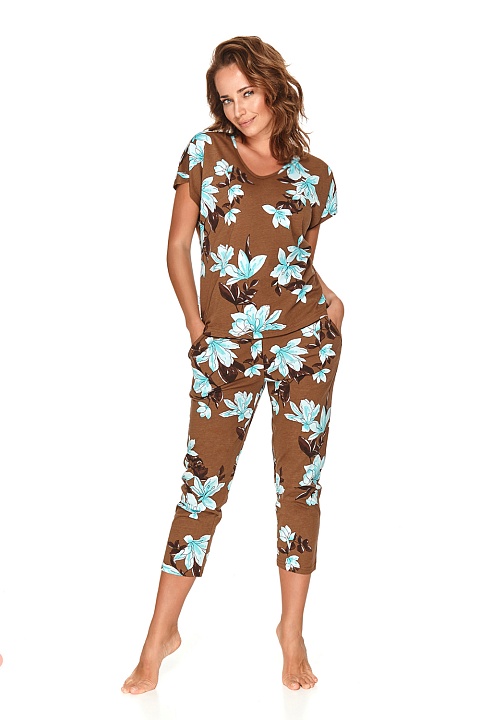 Коричневая женская пижама Larysa. Пижама выполнена из качественного и мягкого хлопка с принтом. Футболка свободного кроя, с коротким рукавом, брюки с мягкой резинкой в поясе, с карманами. Идеально подходит для сна и в качестве домашнего костюма.