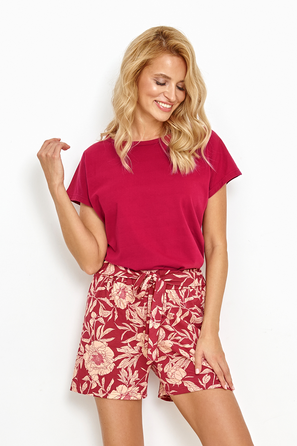 Бордовая пижама из хлопка Jasmine. Однотонная футболка и шорты с цветочным принтом. Футболка с коротким рукавом и круглым вырезом горла. Шорты с мягкой резинкой в поясе, по ширине регулируются внешним шнурком. Идеально подходит для сна и в качестве домашнего комплекта.