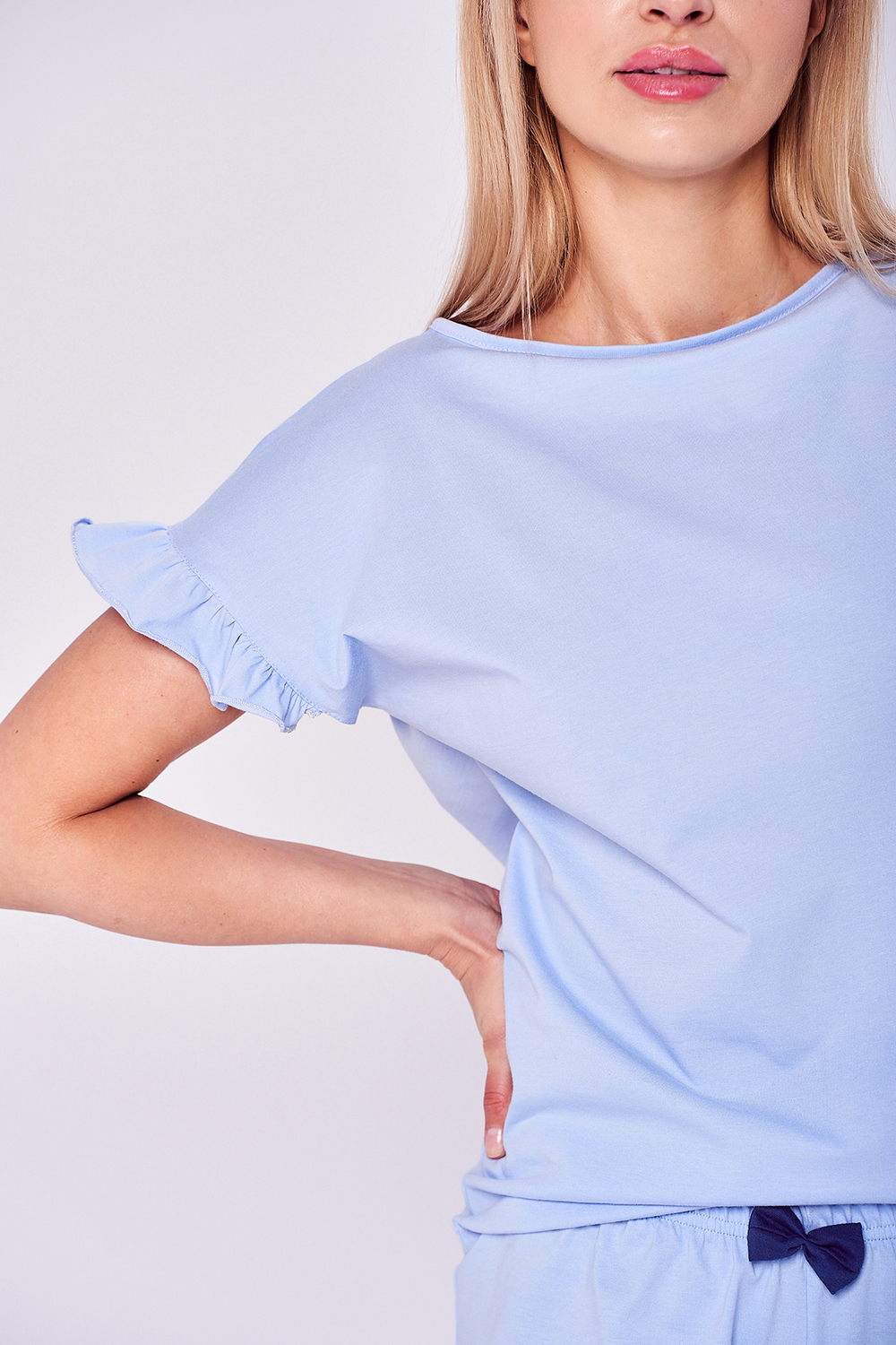 Женская пижама Love. Однотонные футболка и шорты декорированы рюшами и бантиком. Футболка с коротким цельнокроеным рукавом и круглым вырезом горла. Шорты с мягкой резинкой в поясе. Идеально подходит для сна и в качестве домашнего комплекта.