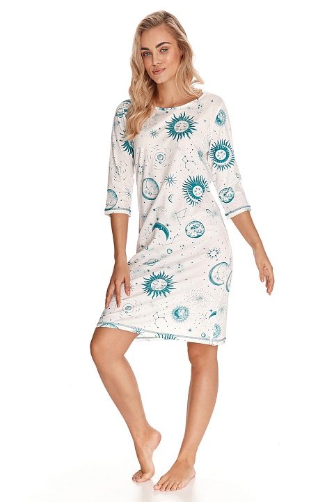 Сорочка из хлопка Bruna. Изготовлена из высококачественного хлопка цвета экрю с нежным рисунком. Сорочка с рукавами 3/4, круглым вырезом горловины и длиной до колена. Выглядит очень женственно и элегантно.