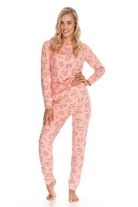 Стильная женская пижама Serena. Пижама выполненная из качественного и мягкого хлопка состоит из кофты и брюк с милым принтом. Кофта свободного кроя, с длинными рукавами и круглым вырезом горла, брюки с мягкой резинкой в поясе, внизу обработаны манжетами. Пижама очень красивая и комфортная, также будет замечательной домашней одеждой и хорошим подарком для любимого или близкого человека.