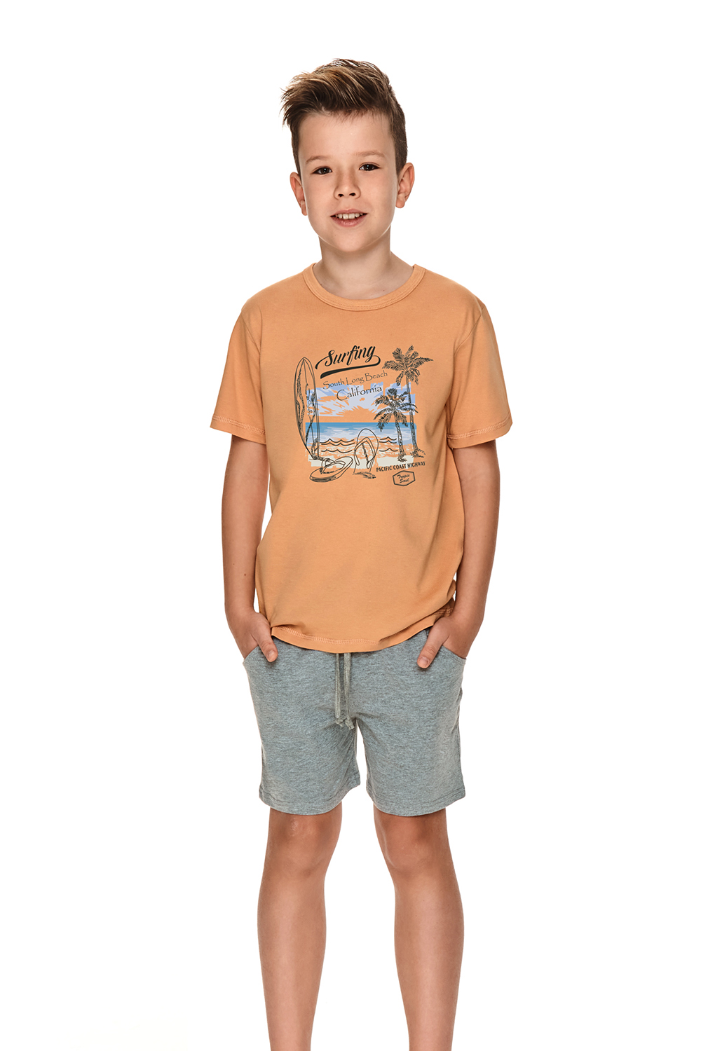Яркая пижама для мальчиков Wadim. Пижама выполнена из качественного и мягкого хлопка, состоит из оранжевой футболки с коротким рукавом и прямых серых шорт с карманами. Пижама очень комфортная и удобная, будет отличной домашней одеждой и замечательным подарком для близких людей.