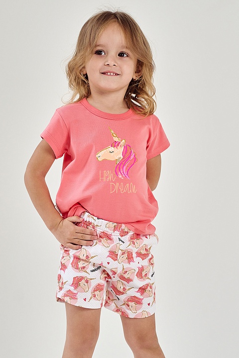 Хлопковая пижама для девочек Mila. Пижама выполненна из качественного и мягкого хлопка, состоит из футболки и шорт. Розовая футболка с рисунком спереди, шорты с забавным принтом. Идеально подходит для сна и в качестве домашнего комплекта.