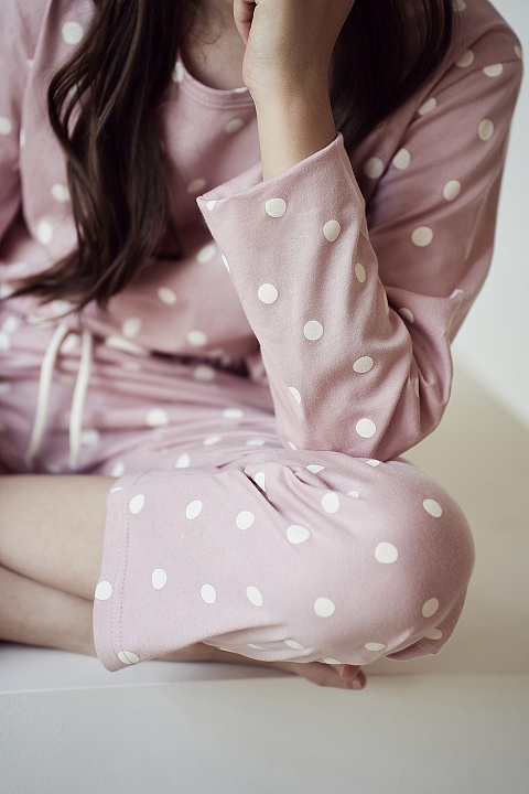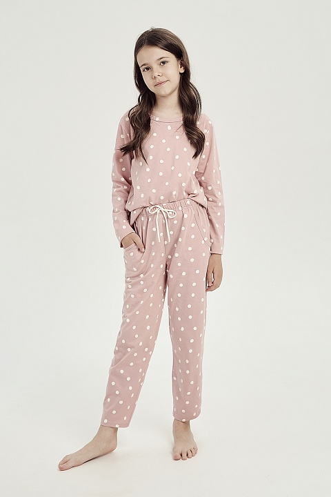 Хлопковая пижама для девочек Chloe в горошек. Лонгслив свободного кроя, с длинным рукавом и круглым вырезом горловины. Брюки с удобными боковыми карманами и мягкой резинкой в поясе, по ширине регулируются внутренним шнурком. Пижама идеально подходит для сна и в качестве домашнего костюма.