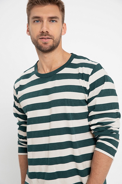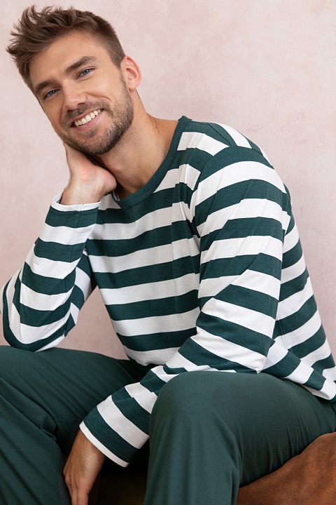 Стильная мужская пижама Blake от польского бренда Taro. Пижама выполнена из качественного и мягкого хлопка зеленого цвета, состоит из футболки с принтом в полоску и однотонных брюк. Футболка с длинными рукавами и круглым вырезом горла, брюки с манжетами, с мягкой резинкой в поясе.
