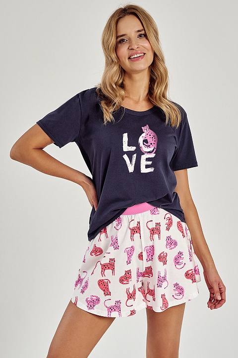 Пижама Annabel выполнена из хлопка. Состоит из футболки синего цвета и шорт с забавным принтом. Пижама очень красивая и комфортная, также будет замечательной домашней одеждой и хорошим подарком для любимого или близкого человека.