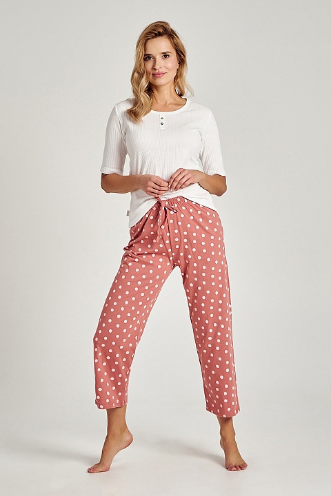 Пижама Paris выполнена из хлопка. Состоит из лонгслива с укороченными рукавами в рубчик и широких брюк в горох. Пижама очень красивая и комфортная, также будет замечательной домашней одеждой и хорошим подарком для любимого или близкого человека.