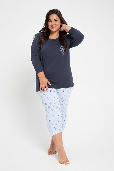 Тесно-синяя пижама из хлопка Magnolia. Однотонная футболка с принтом на груди и брюки с цветочным принтом. Футболка с длинным рукавом и круглым вырезом горла. Укороченные брюки с мягкой резинкой в поясе. Идеально подходит для сна и в качестве домашнего комплекта.