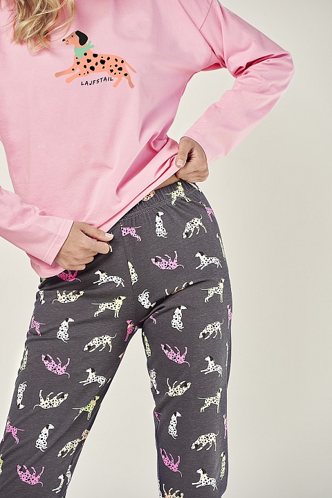 Стильная женская пижама Ruby. Пижама выполненная из качественного и мягкого хлопка состоит из кофты и брюк с милым принтом. Кофта свободного кроя, с длинными рукавами и круглым вырезом горла, брюки с мягкой резинкой в поясе, внизу обработаны манжетами. Пижама очень красивая и комфортная, также будет замечательной домашней одеждой и хорошим подарком для любимого или близкого человека.