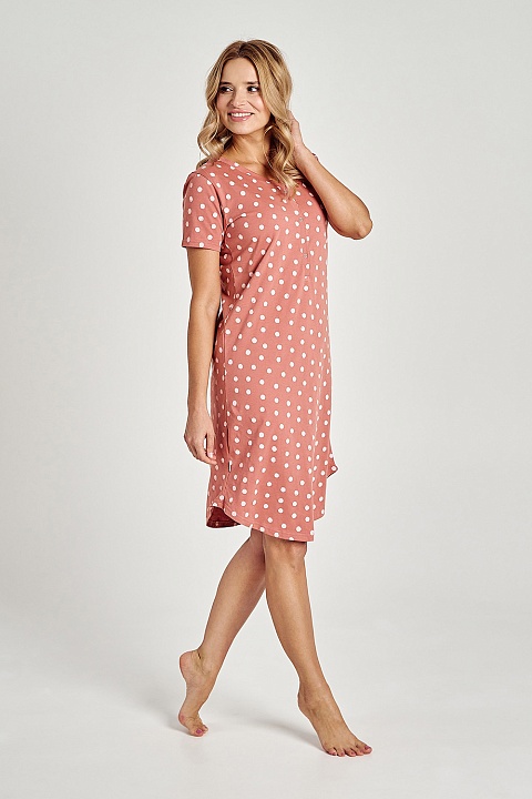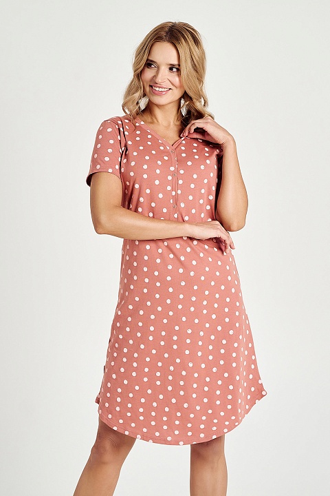 Сорочка из хлопка Ivy. Изготовлена из высококачественного хлопка кораллового цвета с принтом в горох. Сорочка с короткими рукавами, длина выше колена, на груди пуговицы. Выглядит очень женственно и элегантно.