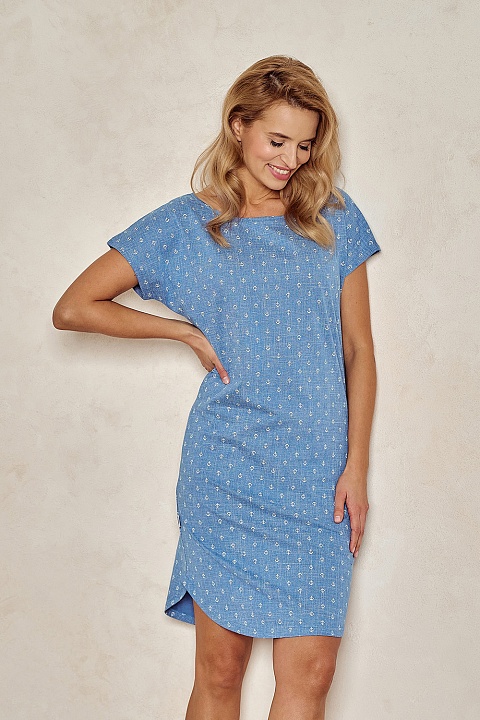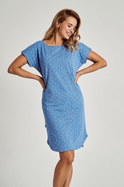 Сорочка из хлопка Leona. Изготовлена из высококачественного хлопка голубого цвета с милым принтом. Сорочка с короткими рукавами, длина выше колена, внизу по бокам небольшие вырезы. Выглядит очень женственно и элегантно.