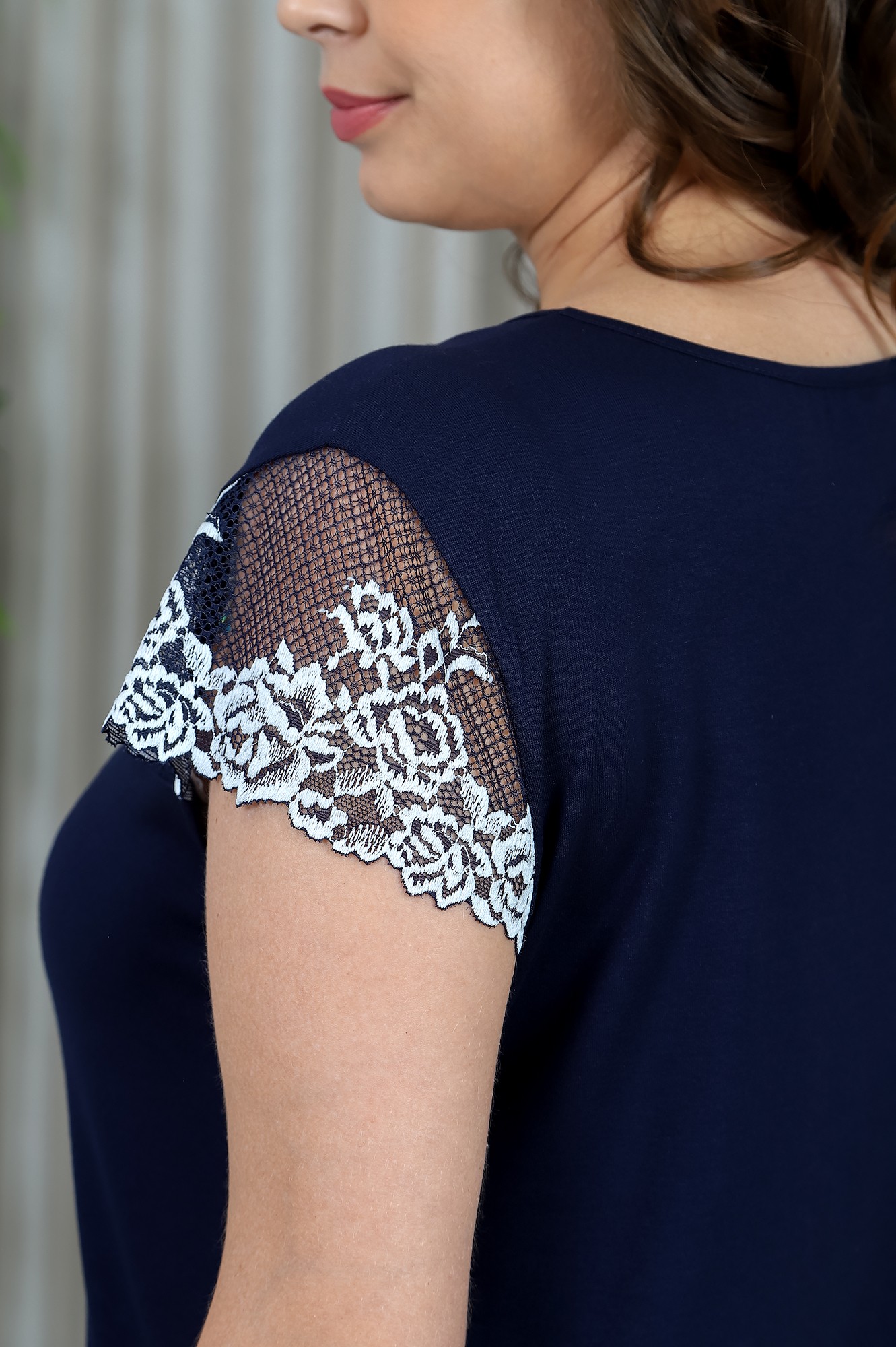 Пижама из гладкокрашеного трикотажного вискозного полотна, состоящая из футболки и брюк. Футболка – с короткими втачными рукавами из кружева и горловиной овальной формы, окантованной основным материалом. На полочке – притачная кружевная кокетка v-образной формы.Брюки – классического покроя, свободные, с эластичной тесьмой по талии.