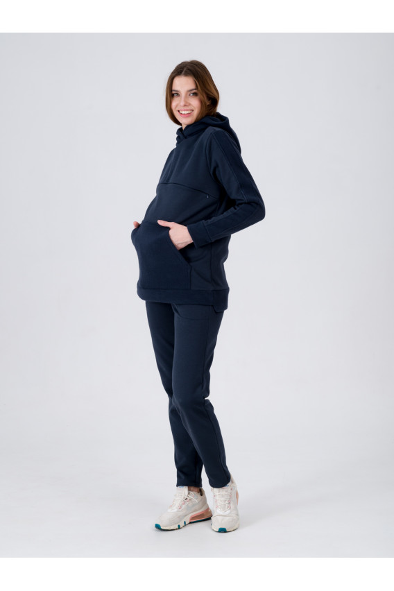 Особый крой позволяет носить костюм на всем протяжении беременности, так как предусмотрено место для животика, и в период после рождения малыша. Благодаря потайной молнии мама сможет покормить малыша с комфортом в любом месте. Брюки будут всегда удобны за счет шнурка на поясе, а эластичный бандаж будет мягко поддерживать животик.