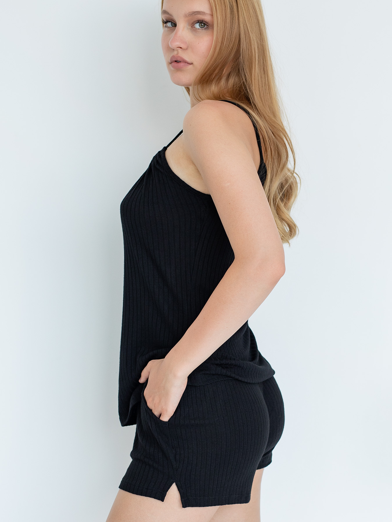 Базовый черный топ домашней коллекции Opium. Выполнен из вискозного трикотажа «в рубчик». Декольте обрамляют складочки, образованные сборкой на завязывающийся спереди шнурок, который переходит в тонкие бретели. Свободный силуэт и струящаяся ткань – незаменимые атрибуты домашнего стиля.